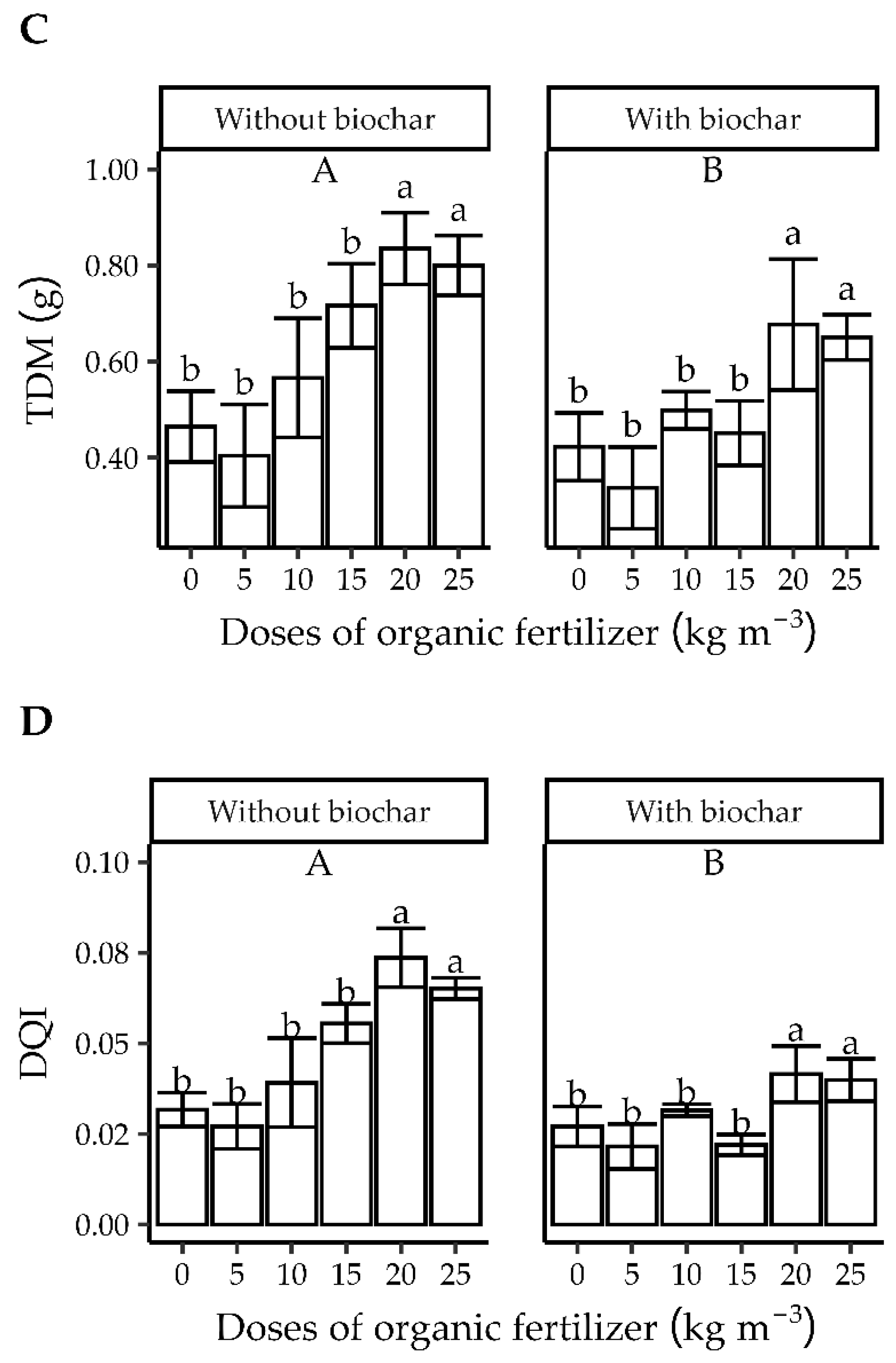 Variable | Biochar Levels | Doses of Organic Fertilizer (kg m−3) | |||||