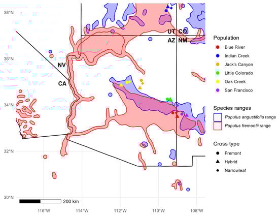 Hybridization has important implications for the ecology and evolution of many forest trees [,,]. In Populus L., investigations of hybridization have revealed unexpected patterns of reproductive isolation in European species [,], suggesting that post-zygotic selection, assortative mating, or selection against incompatible genotypes may serve to strengthen reproductive barriers between species, despite ongoing gene flow. A study of hybridization between two Populus species, Fremont (P. fremontii S. Watson) and narrowleaf (P. angustifolia E. James ex Torr.) cottonwood, in North America has also documented the movement of genes within and across hybrid zones between these two morphologically and genetically differentiated species, suggesting the formation of previously established reproductive barriers that are compromised in regions of overlap []. In this case, hybridization has been shown to affect ecological interactions that promote biodiversity and influence community structure [,,,], with important implications for the evolutionary trajectories of dependent communities [].