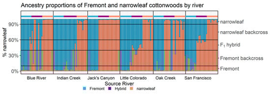 Initial studies of P. fremontii × P. angustifolia hybrid populations using restriction-length polymorphisms (RFLPs) for genotyping had indicated that backcrossing was primarily unidirectional, where fertile F1 hybrids were produced and then backcrossed with P. angustifolia, but not P. fremontii [,]. Later studies revealed that backcrossing in hybrid populations of P. angustifolia and P. deltoides, another broadleaf cottonwood species, was bi-directional []. Principal coordinate analysis in our study showed that hybridization across all river systems was bi-directional to varying degrees, with hybrids evenly spread across the narrowleaf and Fremont clusters, indicating backcrossing to both parents. Calculations of ancestry using Structure as well as hybrid index values were able to distinguish backcrossed individuals and reveal that different river systems had different profiles of hybridization, with some exhibiting more backcrossing to one or both parents than others. Percent ancestry and hybrid index also determined that many putative hybrids were of pure narrowleaf or pure Fremont ancestry, showing that morphology may not be a reliable indicator of true hybrid status. Percent ancestry derived from Structure analysis provided estimations of ancestry for parents as well as hybrids, giving it an advantage in genotyping compared to hybrid index, which calculated hybrid indices based on using assigned parents as representative genotypes.