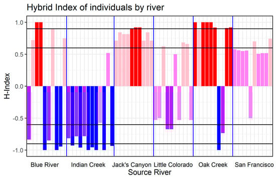 Transformed Hybrid Index Score of putative hybrid individuals, grouped by sampling locations. Black gridlines are placed at 0.6, 0.9, −0.6, and −0.9 Transformed-H-index values to help visualize whether an individual is considered of “Pure” Fremont (<−0.9, blue) or narrowleaf (>0.9, red) ancestry, a F1 generation hybrid (between −0.6 and 0.6, violet), or some generation of backcross of hybrid to Fremont (between −0.6 and −0.9, purple) or narrowleaf (between −0.6 and −0.9%, pink). H-index calculations reveal that the putative hybrids of many sampling locations are of pure or hybrid-backcross ancestry to either Fremont (Indian Creek) or narrowleaf (Jack’s Canyon, Oak Creek, and San Francisco River) ancestry. Other sampling sites exhibit a mix of hybrid and hybrid-backcross indices. All samples were originally classified as hybrids based on morphology with intentions of further genotyping. Transformation of H-indices is performed by subtracting 1 from all H-index values below 0.5., e.g., an H-index value of 0.2 (classified as a hybrid backcross to Fremont) would have a Transformed-H-index value of −0.8.