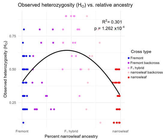 Within-individual observed heterozygosity compared to the relative proportion of Fremont (left) or narrowleaf (right) ancestry, as measured by Structure-derived percent narrowleaf ancestry. Colors represent cross type classification.