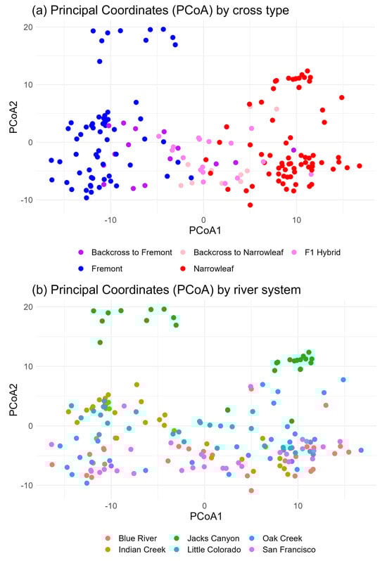 Based on our categorical results obtained from Structure analysis (parents, hybrids, and backcrosses), we calculated standard genetic diversity and structure metrics including percent polymorphic loci (%P), average number of alleles per locus (NA), effective number of alleles per locus (NE), expected and observed heterozygosity (HE and HO), and FIS and FST, all of which were calculated per site and per cross type using GenAlEx v. 6.52 []. We also calculated pairwise FST values between sites using Analysis of Molecular Variance (AMOVA), as well as observed and expected heterozygosity (HE, HO) across river systems. We then calculated distance matrices using Nei’s genetic distance for all cross types and all the six sites, as well as for all cross types within each site. Nei’s genetic distance was then used to visualize genetic clustering using principal coordinate analysis (PCoA).