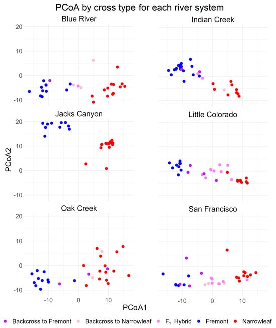 Our hypothesis of genetic intermediacy of F1 hybrids and bidirectional introgression with both parent species is supported by principal coordinate analysis (PCoA) based on Nei’s genetic distance (Figure 6a). In addition, two distinct clusters of Fremont cottonwood are identified, and one of narrowleaf cottonwood. Hybrids (F1 and backcrosses), however, span the genetic range between the two parent species. The same cross type associations indicate that river sites are not genetically well-differentiated (consistent with estimates based on FST), except for Jack’s Canyon, where divergence, primarily driven by Fremont cottonwood, occurs relative to the other river sites (Figure 6b). Individual within-river analysis based on PCoA of all cross types per site reveals that some sites, such as Jack’s Canyon, the Little Colorado River, and the San Francisco River, have distinct differentiation of hybrid cottonwoods, while, in the other three river systems, hybrids are more closely associated with Fremont, narrowleaf, or both, again providing support for our hypothesis of bidirectional backcrossing (Figure 7).