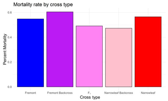 In terms of mortality, the lowest percent mortality occurred in F1 and backcross hybrids to narrowleaf (47%), followed by higher mortality in Fremont (~60%) and narrowleaf, but ANOVA and Tukey test showed no statistically significant differences in mortality among the cross types (Figure 10), suggesting that hybrids do not necessarily survive better than either parent species in a common garden setting. Together, these results provide partial, but mixed, results suggesting that when hybrids are grown in a common environment, they are not necessarily more vigorous than either parent species.