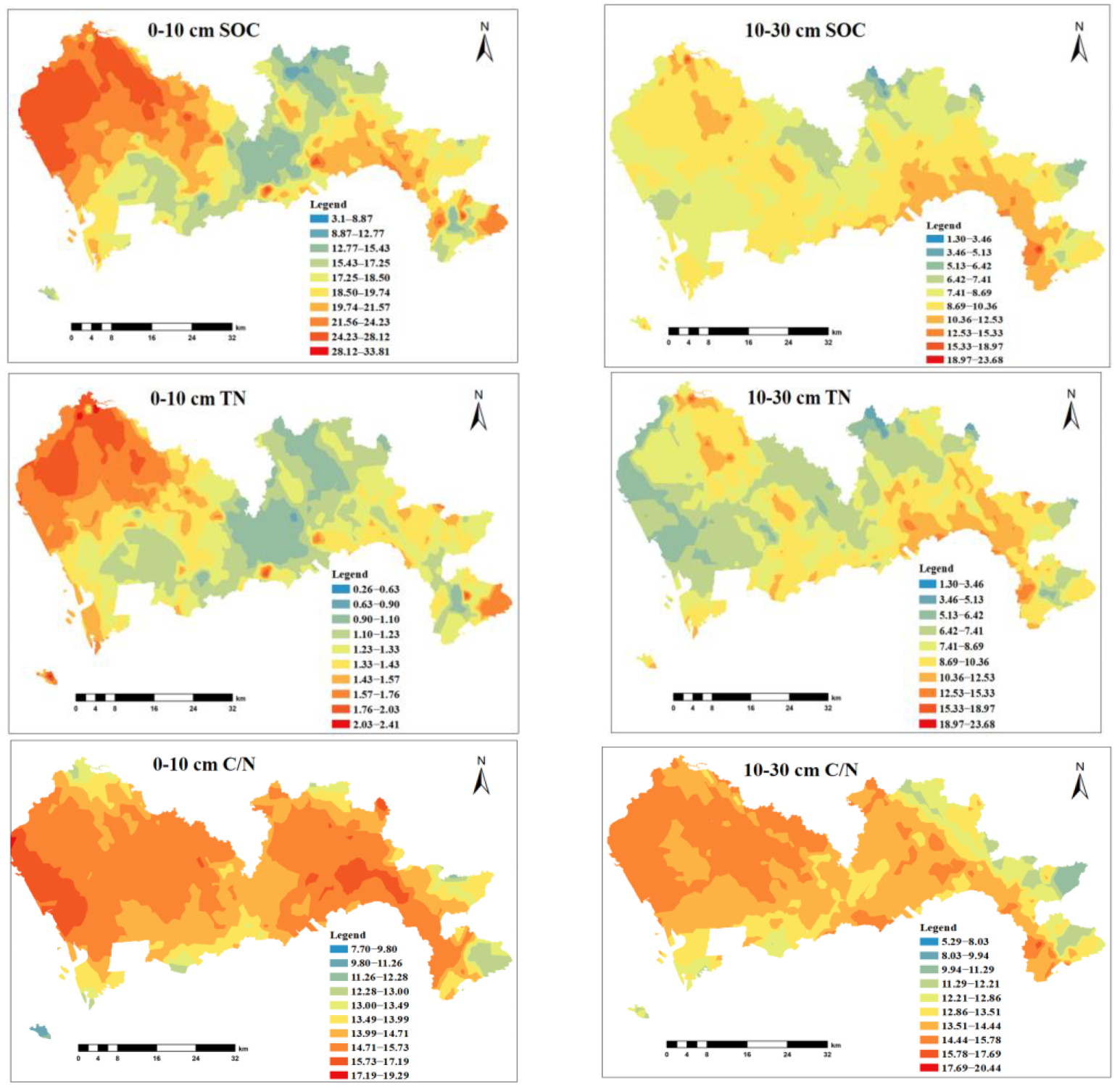 3.2. Characterization of the Spatial Distribution of SOC, TN, and C/N