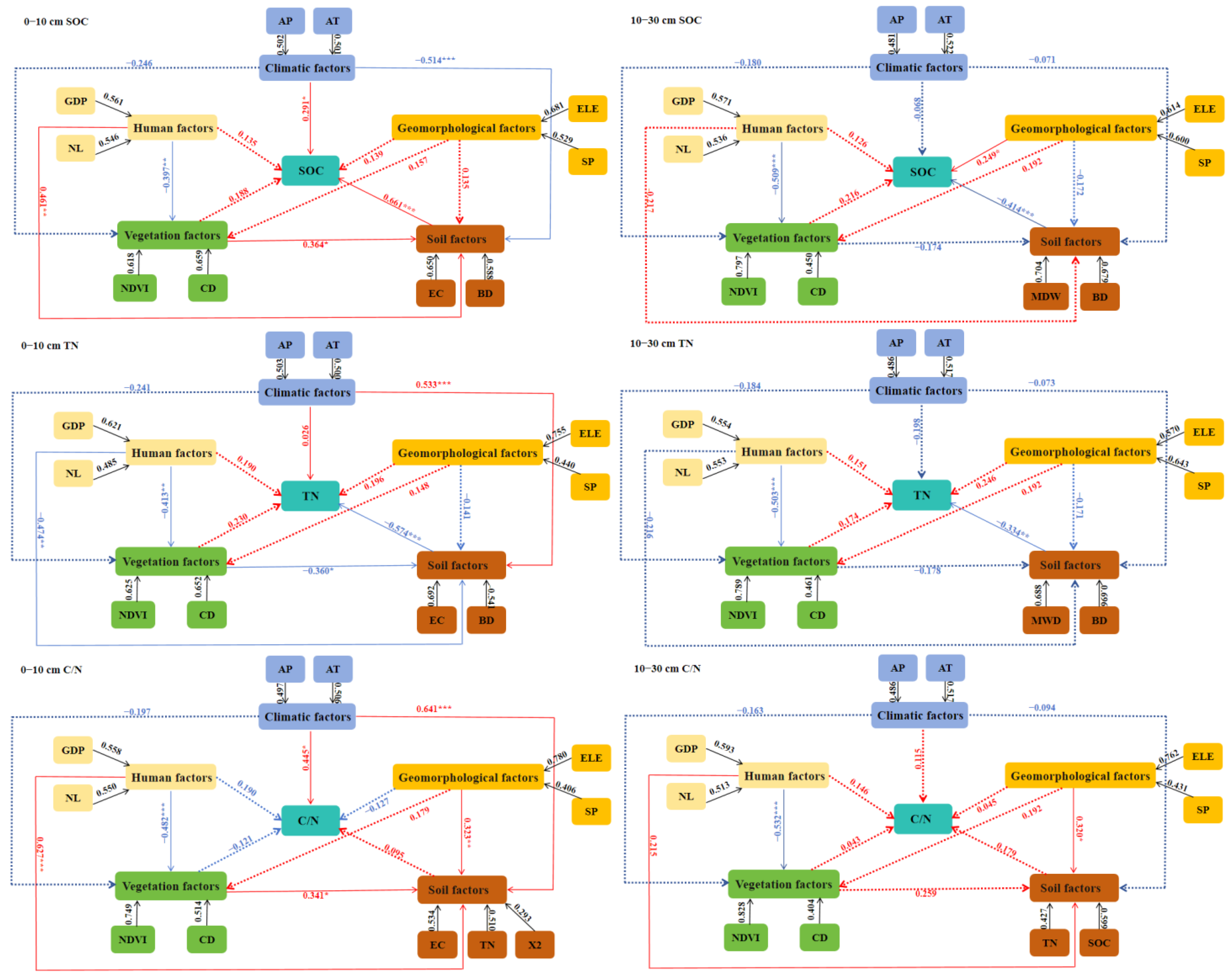 3.8. Structural Equation Analysis of SOC, TN, and C/N Using the Partial Least Squares Method