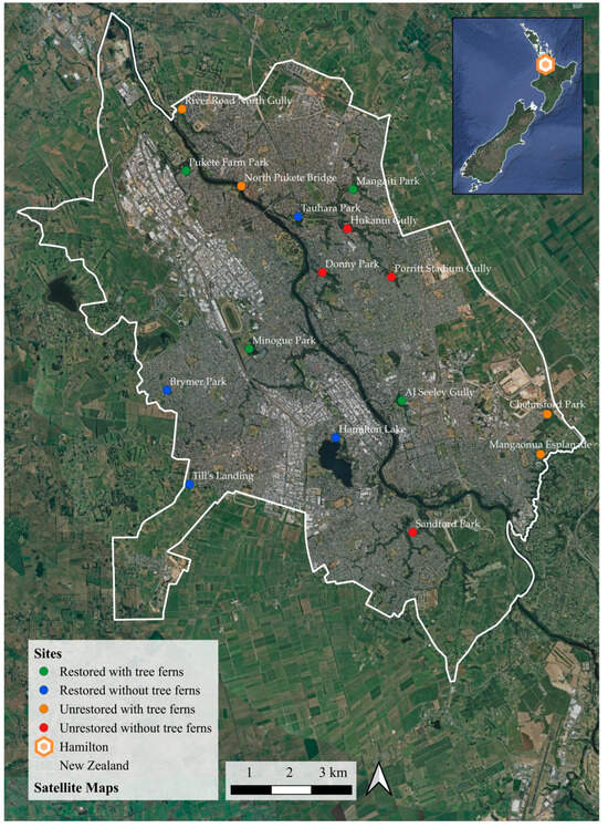 Site locations in Hamilton, North Island, New Zealand. Each dot represents a site where one 20 × 10 m2 vegetation plot was assessed, and the colour denotes the site type (i.e., green dots are restored sites with tree ferns, blue dots are restored sites without tree ferns, orange dots are unrestored sites with tree ferns and red dots are unrestored sites without tree ferns). A map of New Zealand is also provided, indicating the study location (Hamilton), near the centre of the North Island.