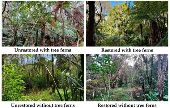 Example sites of the four site types based on restoration status (restored, unrestored) and the presence of tree ferns (with, without).