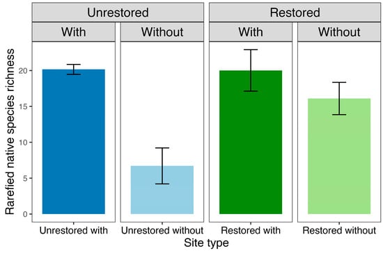 Mean rarefied native vascular plant species richness for the four site types based on restoration status (restored, unrestored) and the presence of tree ferns (with, without). Error bars represent one standard error.