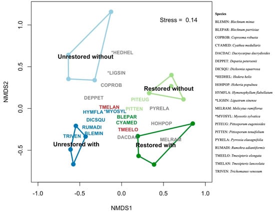Nonmetric multidimensional scaling (NMDS) ordination of plant community composition by abundances. Convex hulls are drawn around the four site types: restored with tree ferns (dark green), restored without tree ferns (light green), unrestored with tree ferns (dark blue), and unrestored without tree ferns (light blue). The ordination achieved a “fair” stress score of 0.14. The coloured dots represent the sites, and six–letter codes represent the indicator or abundant species (see legend for scientific names). An asterisk denotes an exotic species. Species colours represent indicator species of the site types: restored with tree ferns (dark green), restored without tree ferns (light green) and unrestored with tree ferns (dark blue). The species in grey are eight of the most abundant species, and the species in red (2) represent indicators of unrestored sites with tree ferns that are also abundant species. The ten most abundant species accounted for 62% of the mean relative abundance.