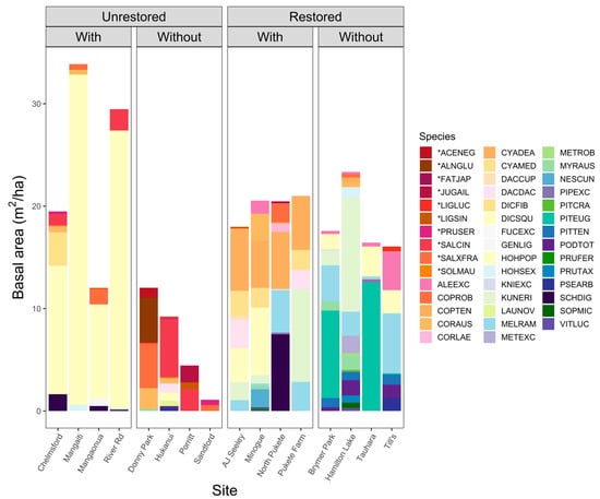 Tree and tree fern basal areas (m2 ha−1) of vegetation plots measured in Hamilton, New Zealand. The 16 plots were assigned to our four site types based on restoration status (restored, unrestored) and the presence of tree ferns (with, without). An asterisk preceding the six-letter codes denotes an exotic species. Scientific and common names associated with the six-letter species codes are provided in Table A3.