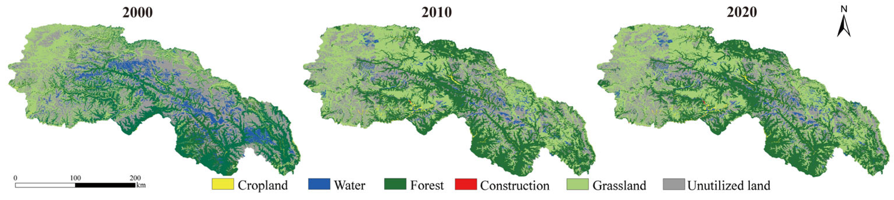 | Land use type | Raster | 2000–2020 | 1 km | China Multiperiod Land Use Land Cover Remote Sensing Monitoring Dataset (CNLUCC) | Resource and Environmental Science Data Center, Chinese Academy of Sciences. (https://www.resdc.cn/ (accessed on 12 May 2024)) |