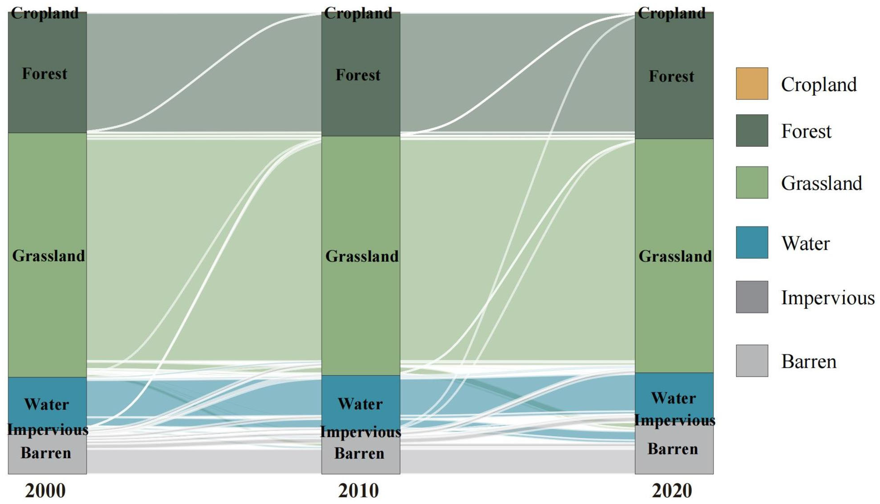 - Hao, J.Y.; Zhi, L.; Li, X.; Dong, S.K.; Li, W. Temporal and spatial variations and the relationships of land use pattern and ecosystem services in Qinghai-Tibet Plateau, China. Ying Yong Sheng Tai Xue Bao 2023, 34, 3053–3063. [Google Scholar]