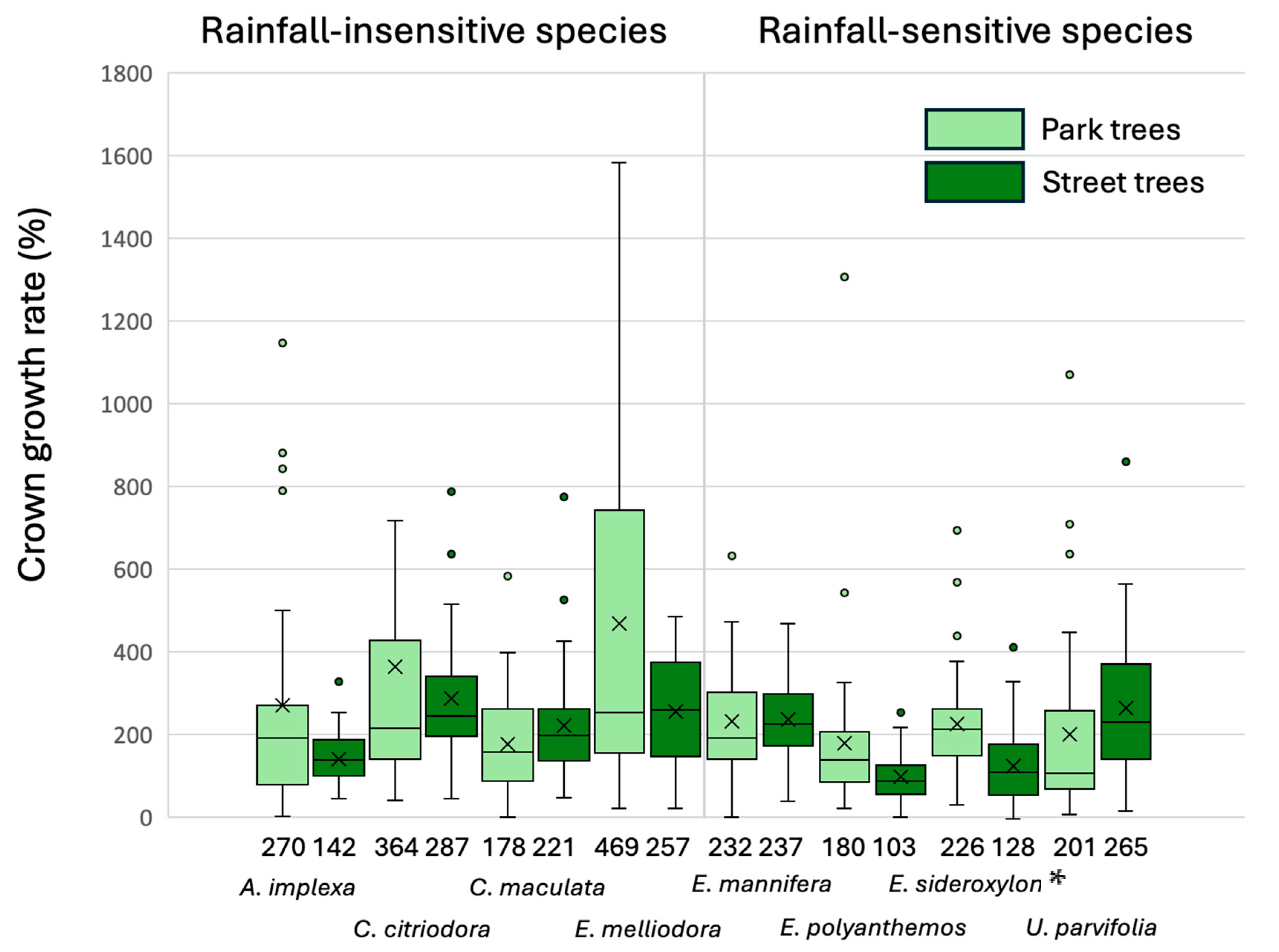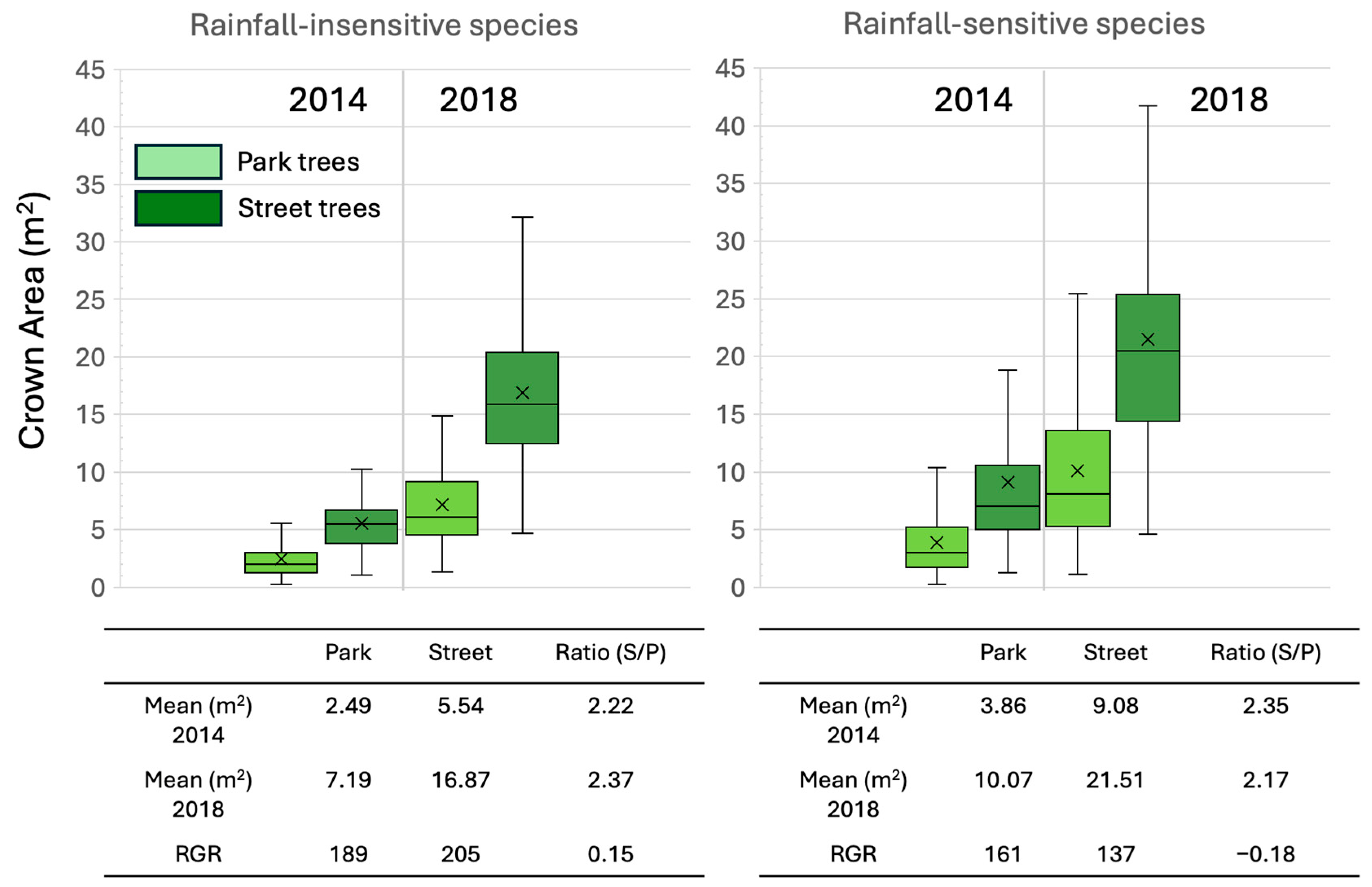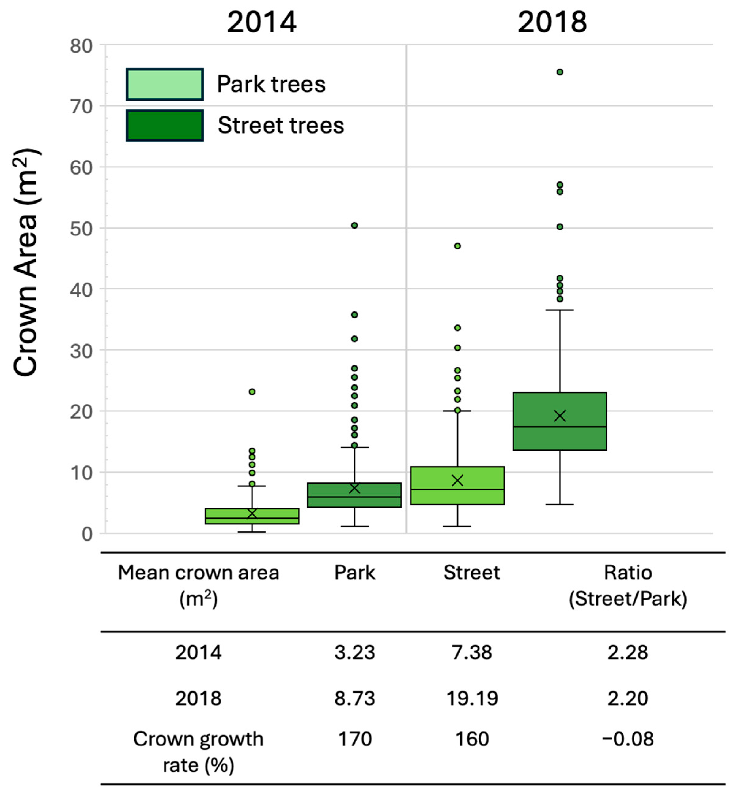 3.2. Urban Tree Crown Growth: All Park Trees vs. All Street Trees