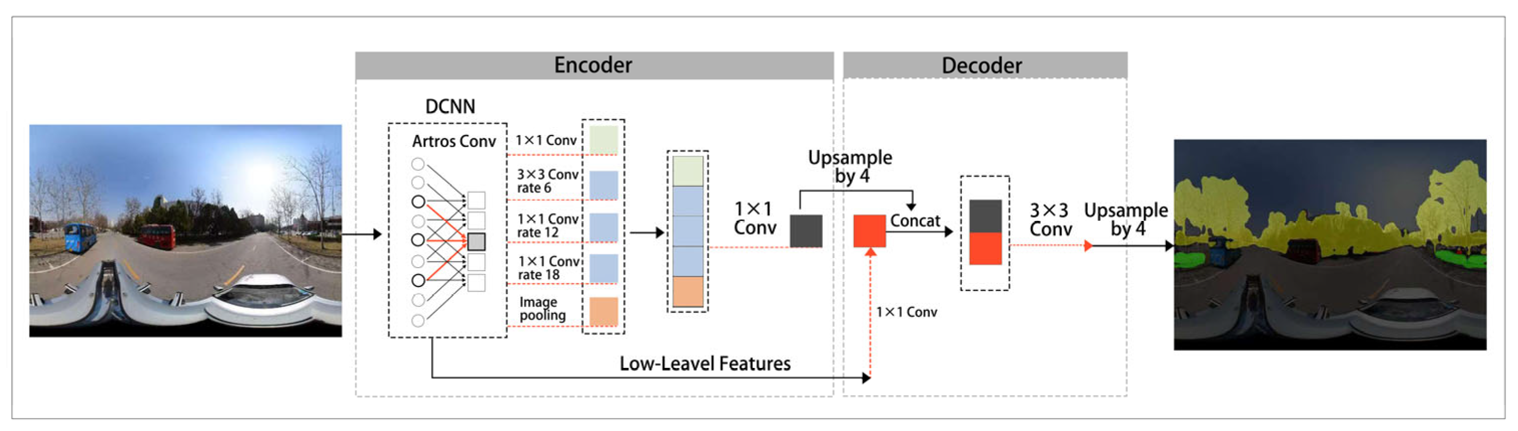 In this study, we used DeepLabV3+ for semantic segmentation of Google Street View (GSV) panoramas to extract streetscape elements, especially vegetation components. DeepLabV3+ is an encoder–decoder semantic segmentation framework proposed by Chen et al. (2018) [