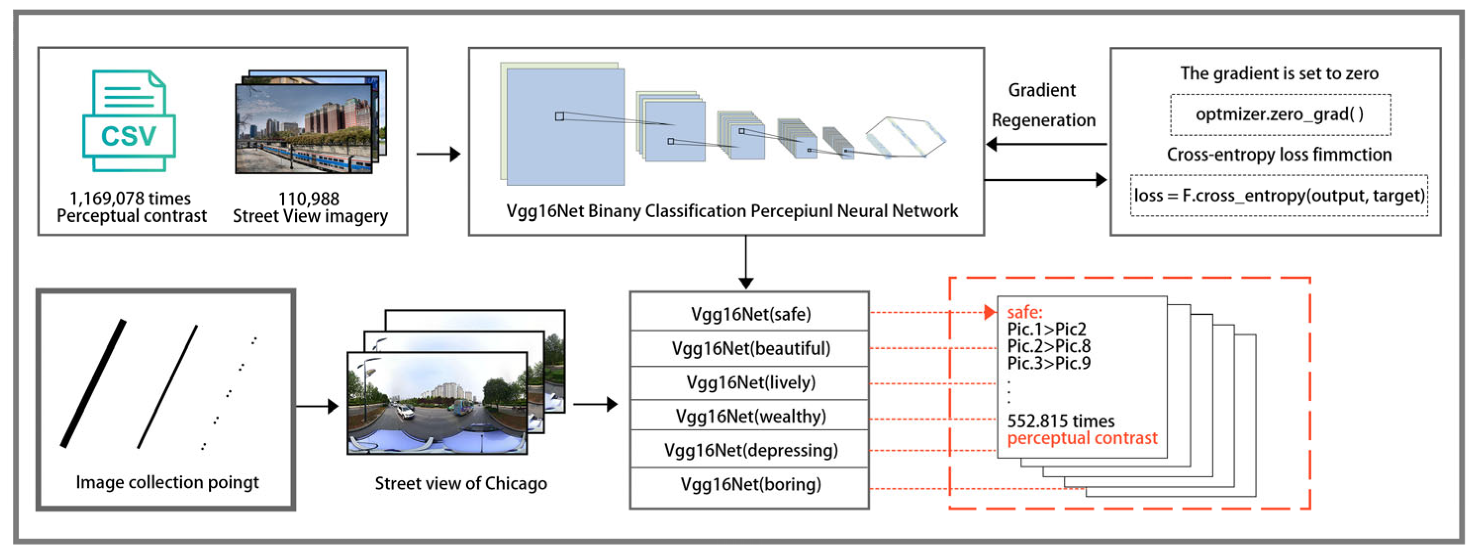 Using the MIT Place Pulse dataset, we prepared pairwise comparison samples for six perception indicators. Each training sample contains a pair of street-view images and a binary outcome indicating which image “wins” the comparison for a given perception dimension. The network was trained as a binary classifier for each perception indicator using cross-entropy loss and backpropagation (