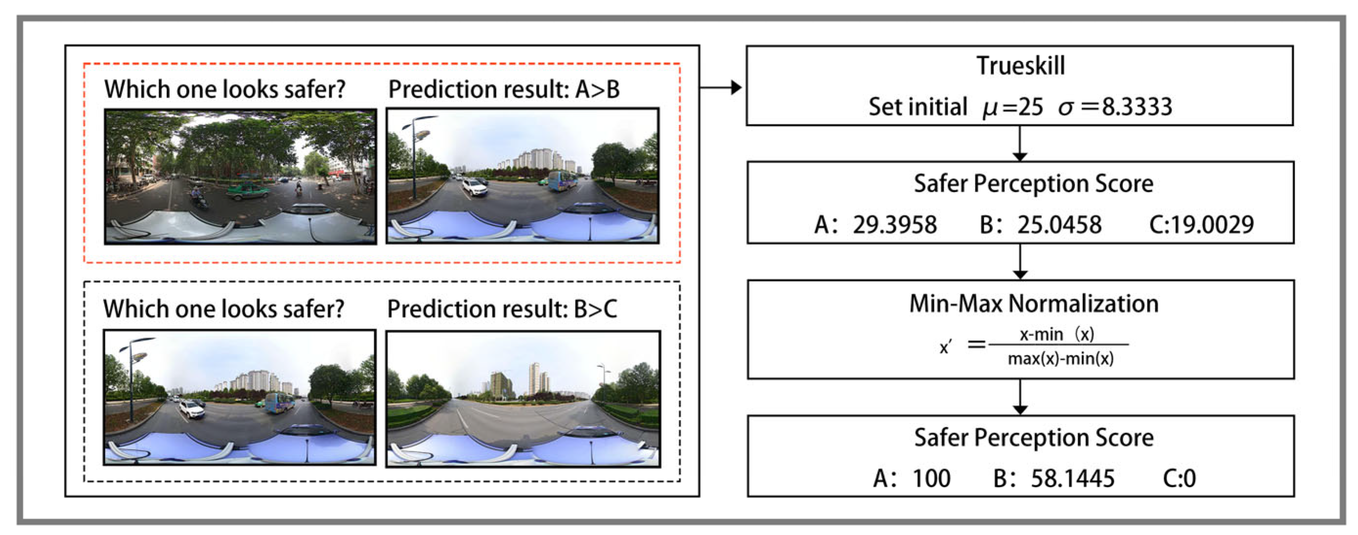 2), where the expected µ is set to 25 and the standard deviation σ is 25/3 across all images. In our study, 459,120 pairwise comparisons (five times the number of street view images) were made among 91,824 images. The resulting perception scores were then normalized and mapped to a [0, 1] range for further spatial econometric analysis. For example, if the safety comparisons indicate A > B and B > C, the normalized scores would satisfy A > B > C, and a rescaled illustration could yield 1.00 for A, 0.5814 for B, and 0.00 for C (