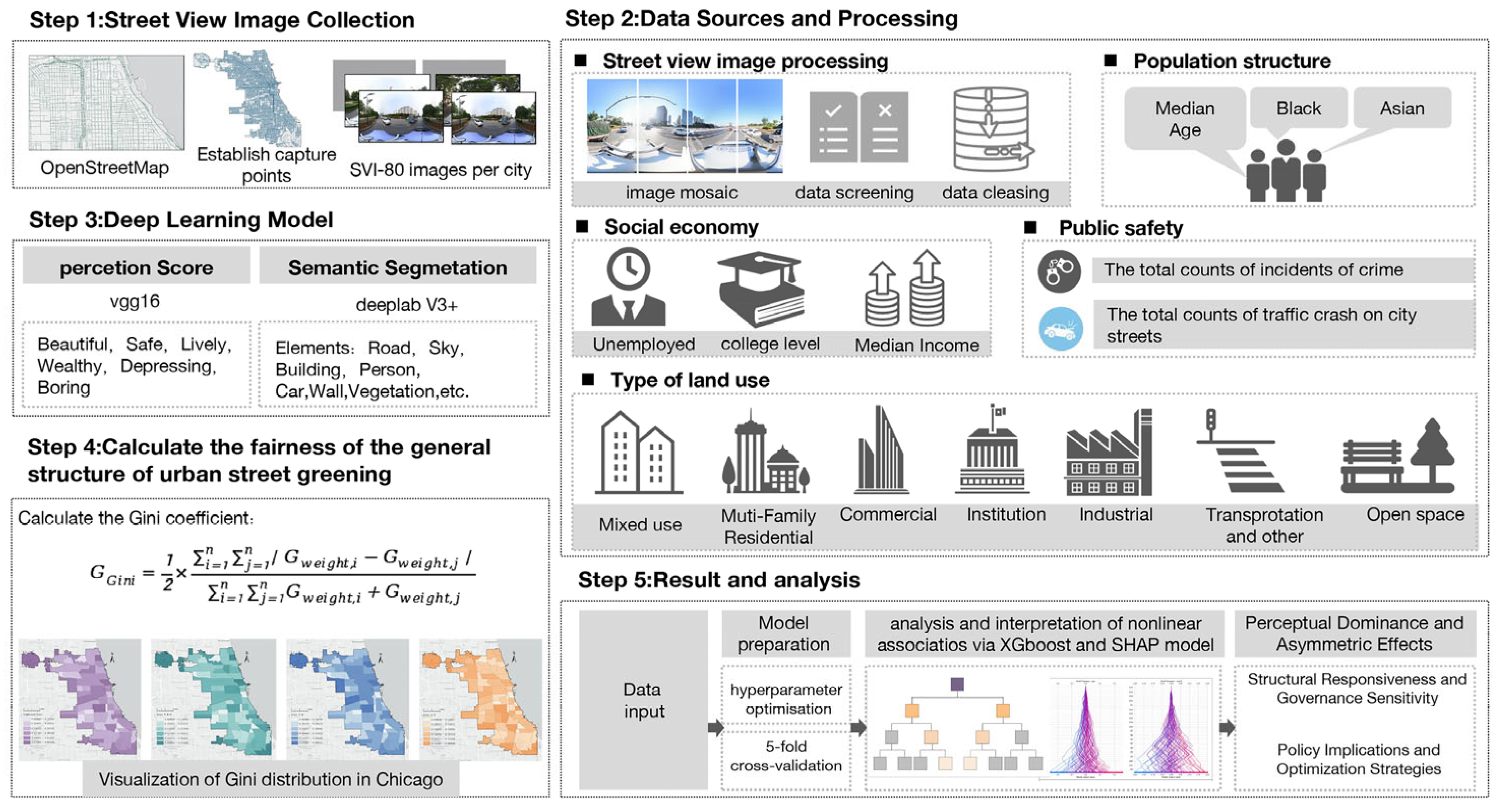 32]. Few studies connect the equity of street greening structure to these perception measures, so the literature still provides limited direct evidence on how street greening inequality links to perceived street quality and to governance response. Although urban greening has long been recognized as a foundation for environmental justice, existing research has largely focused on vegetation quantity or accessibility while neglecting how perceptual experience and governance responsiveness jointly shape the fairness of greening distribution. Traditional approaches relying on static spatial indicators or subjective surveys fail to capture the interactive mechanisms linking street structure, visual perception, and institutional performance. To address the limitations of existing methods and bridge the identified research gaps, this study aims to assess the influence of perceptual experience and socioeconomic indicators on the equity of greening structure distribution, and to uncover the underlying mechanisms driving such equity. To this end, we first develop an equity assessment framework for greening structures. Using Chicago as a case study and integrating multi-source urban data, deep learning, and explainable machine learning, this framework elucidates the role of residents’ perceptual experience and governance responsiveness in shaping the equitable distribution of street greening structures. Furthermore, we introduce the concepts of “environmental recognition sensitivity” and “management-structure reciprocity” to characterize, respectively, the adaptive capacity of urban management systems to perceive and respond to environmental changes, and the interactive relationship between management practices and greening structures, both are key mechanisms through which governance influences greening equity. By establishing this integrated framework, the study provides a methodological pathway for understanding the mechanisms affecting equity in urban street greening, offering both theoretical insights and policy implications for building more inclusive and resilient urban environments.
