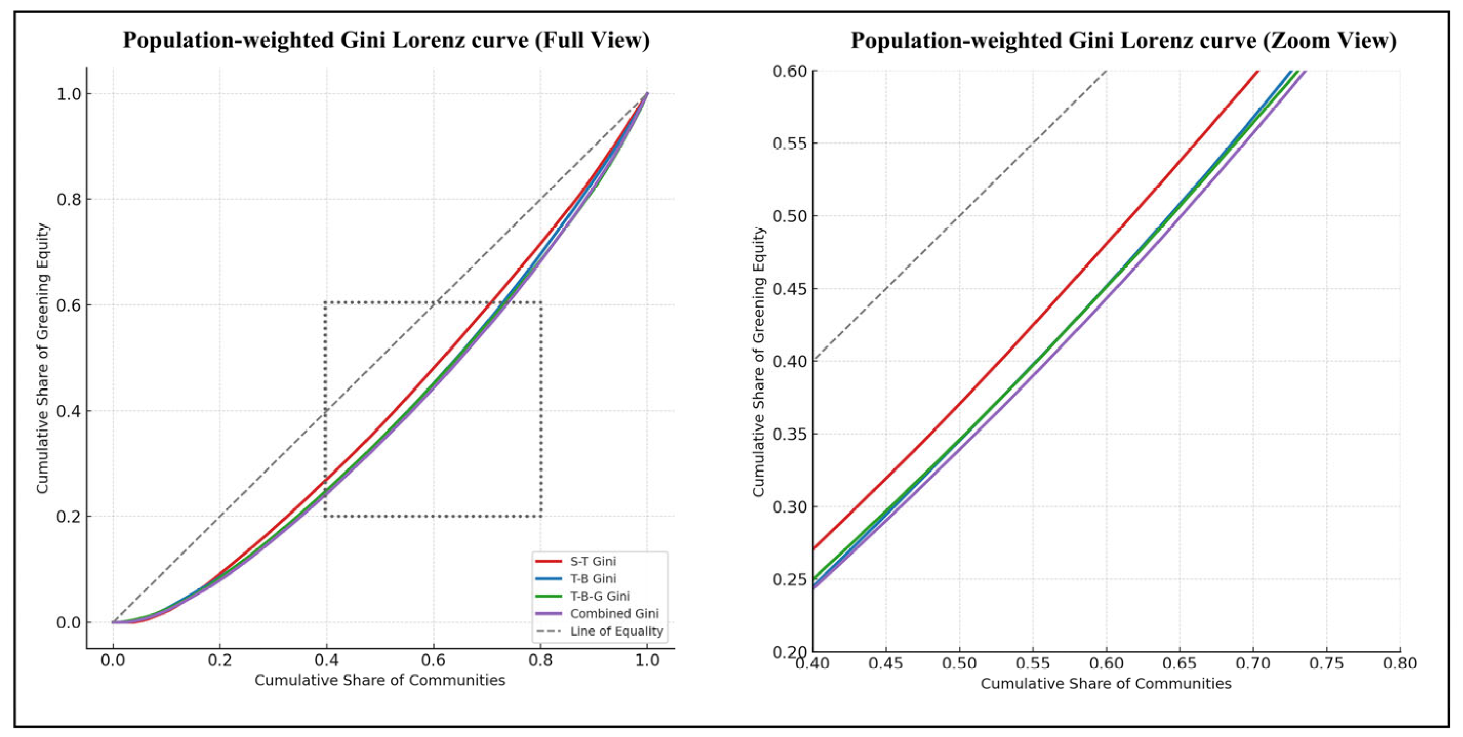 y-axis to highlight detailed differences. All four curves deviate from the line of equality, indicating the existence of inequality in the distribution of street greening resources. The S-T Gini curve lies closest to equality, reflecting a uniform but ecologically limited distribution of single trees. By contrast, the T-B-G and Combined Gini curves show greater deviation, indicating that multi-layer vegetation, while ecologically valuable, is concentrated in fewer communities. The population-weighted approach further reveals that densely populated areas do not necessarily receive proportionally greater greening benefits. The average Combined Gini value, approximately 0.32, indicates a moderate yet spatially uneven pattern of greening equity. These results demonstrate that while single-layer tree structures appear more evenly distributed relative to population, complex multi-layer vegetation systems provide greater ecological value but are spatially concentrated in fewer districts.