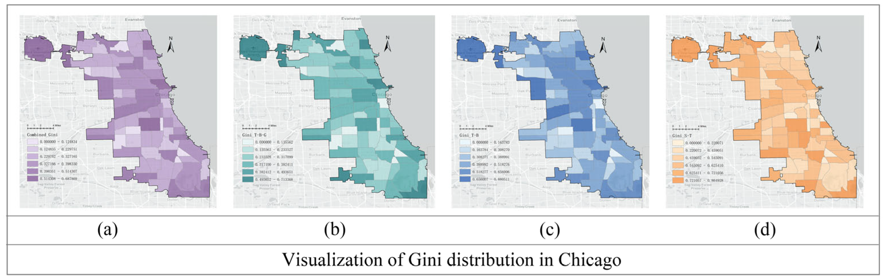 Figure 8 visualizes the spatial distribution of the population-weighted Gini coefficients for four greening structure categories—Combined_Gini, T-B-G_Gini, T-B_Gini, and S-T_Gini. The results reveal clear heterogeneity across the city. Communities in the northern and southern peripheries generally show lower Gini values, suggesting more balanced allocation of vegetation, while central and western districts display higher inequality where commercial and industrial land uses constrain planting space and disrupt the continuity of street vegetation. Among the structural types, S-T_Gini demonstrates the lowest inequality, consistent with its relatively uniform but simple distribution. T-B_Gini shows moderate inequality, reflecting partial structural improvement but persistent imbalance between arterial and local streets. T-B-G_Gini and Combined_Gini exhibit the highest values, representing the most uneven distribution of multi-layer vegetation. Thus, the spatial variation in greening equity is not only extensive but also structurally dependent, with complex configurations being spatially limited despite their greater ecological contribution.