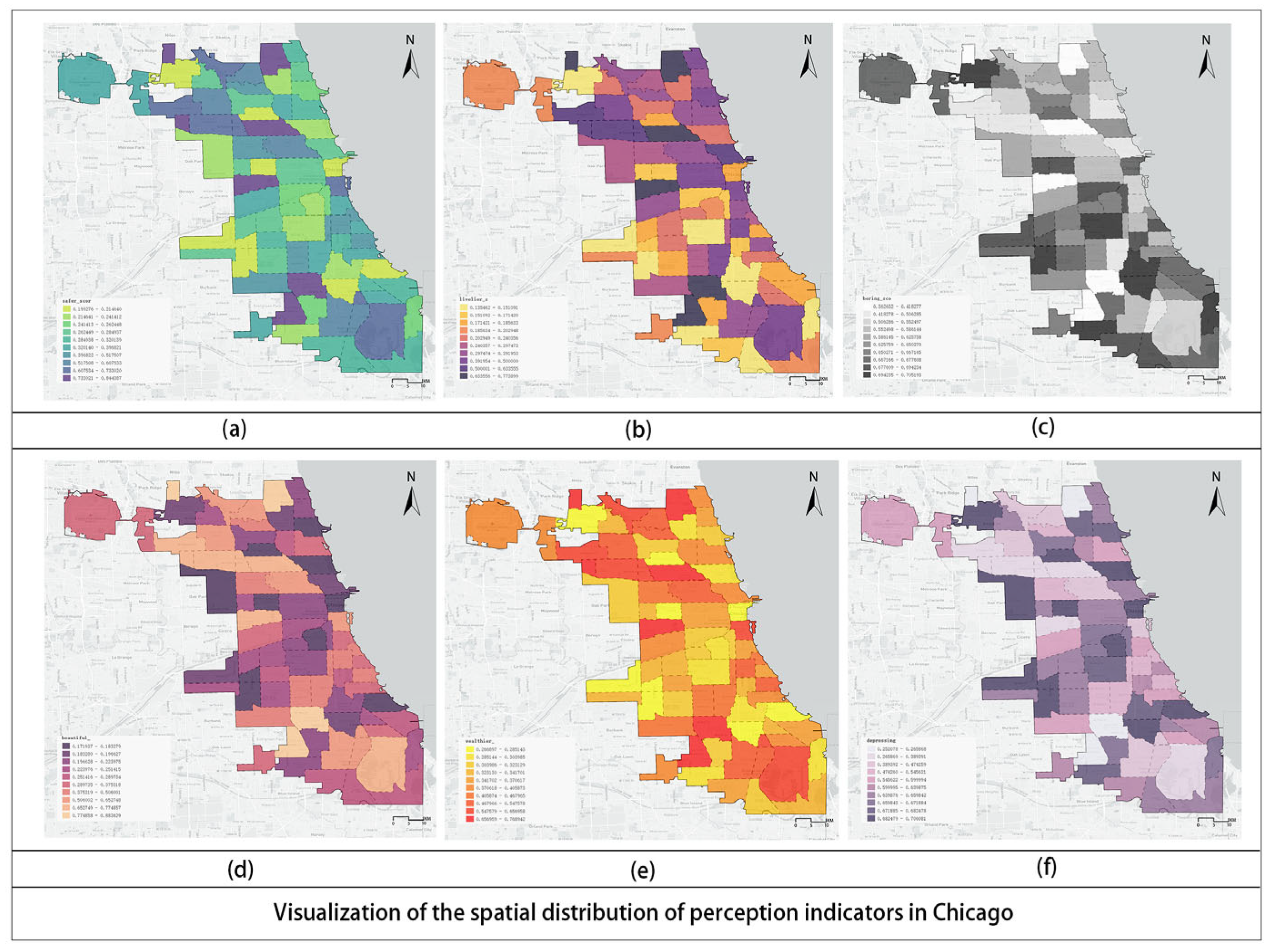 Figure 9 shows the distribution of six perception indicators derived from the Urban Street Perception Index (USPI): Beautiful, Safer, Livelier, Wealthier, Boring, and Depressing. Comparing