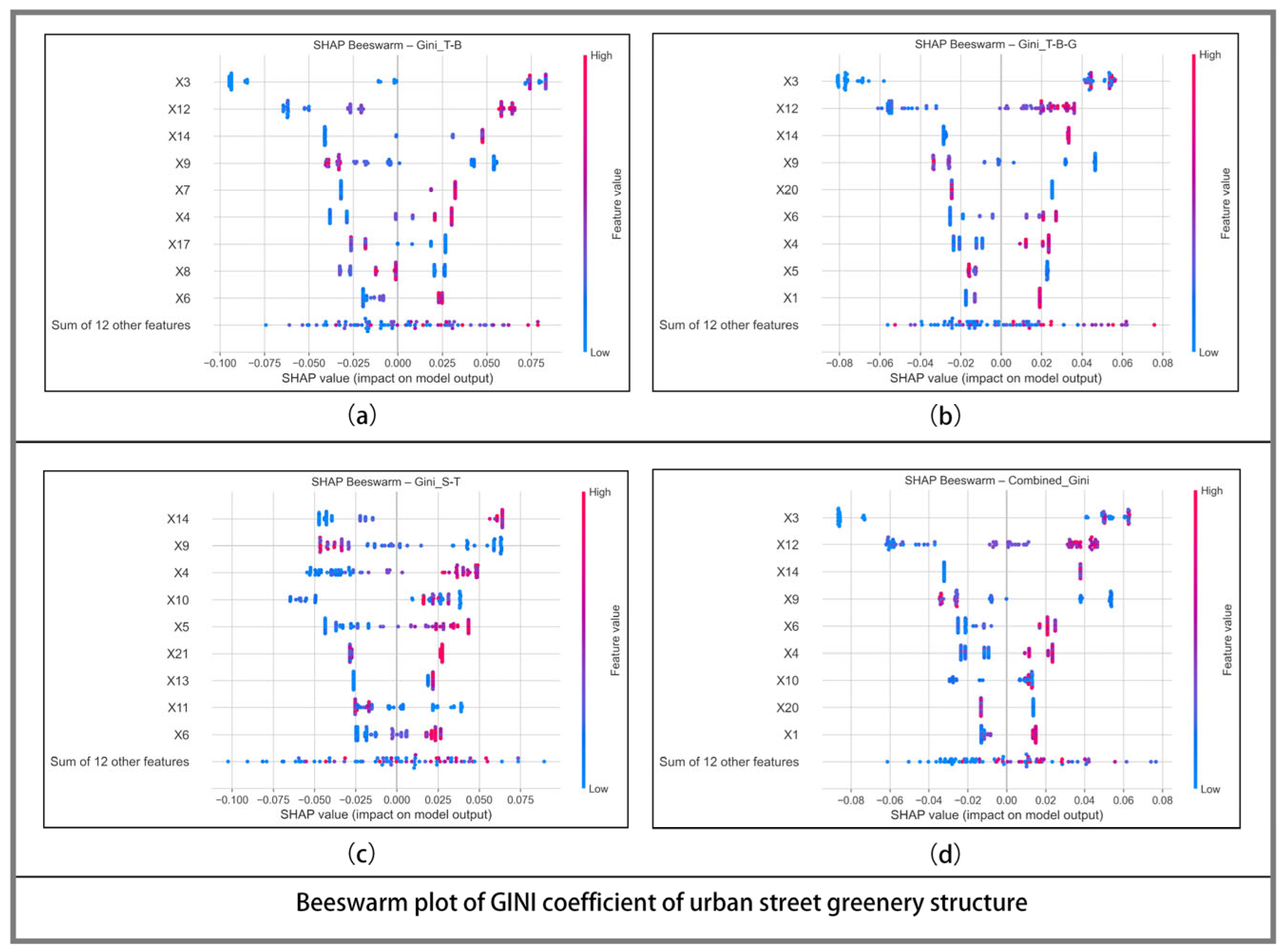 Figure 10 presents the Beeswarm plot summarizing SHAP values for all variables in the Combined_Gini model. The results demonstrate that perceptual factors dominate the explanation of greening equity. Among them, Beautiful and Safer have strong negative SHAP values, showing that higher levels of positive perception are associated with lower inequality. In contrast, Boring and Depressing display strong positive SHAP values, meaning that higher negative perception corresponds to increased inequality. Structural variables also play a substantial role: greater T-B-G coverage and vegetation diversity contribute to lower Gini values, whereas dominance of single-tree (S-T) vegetation increases inequality. Socioeconomic indicators such as income and education contribute modestly compared with perceptual and structural factors, confirming that equity in street greening depends primarily on perceptual and physical attributes rather than demographic differences.