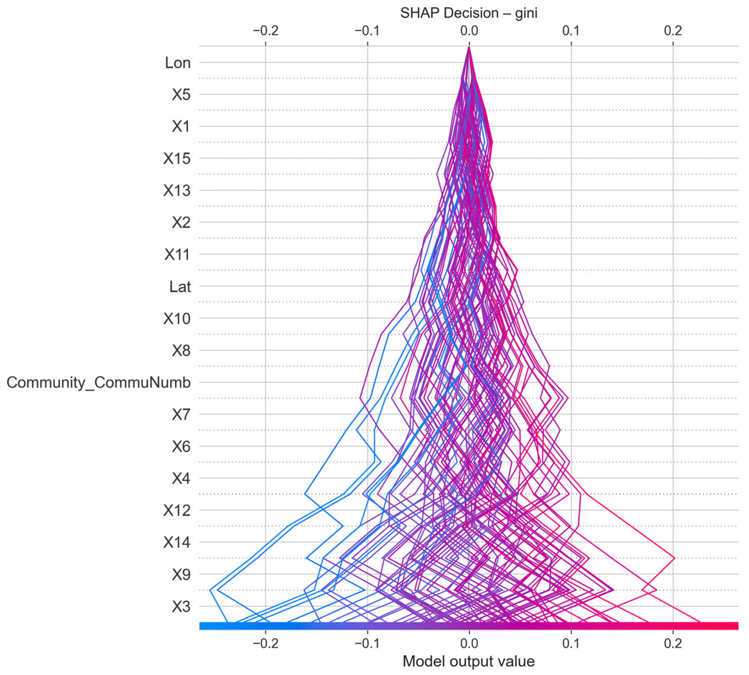 Figure 11 presents the SHAP decision plot illustrating how different socio-economic, land use, and perceptual variables influence the predicted Combined_Gini values. The results show that inequality in street greening is shaped by multiple interacting factors. Among socio-economic attributes, communities with higher median income (MEDINC, X6) and larger shares of Asian residents (ASIAN, X3) tend to exhibit lower predicted Gini coefficients, indicating that economic stability and demographic diversity are associated with fairer greening distributions. In contrast, higher unemployment rates (UNEMP, X4) and greater proportions of industrial or transportation land (INDperc, X11; TRANSperc, X12) increase inequality, reflecting structural disadvantages in less residential or heavily built-up areas. Land use intensity also plays a significant role: a higher share of commercial land (COMMperc, X9) is linked to higher Gini values, implying that business-dominated districts tend to concentrate greening resources unevenly, while greater proportions of open space (OPENperc, X13) contribute to reducing inequality by expanding accessible vegetation coverage. Perceptual indicators show the strongest and most direct effects, as higher Beautiful (X19) and Safer (X16) scores correspond to lower Gini coefficients, confirming that positive visual and emotional experiences coincide with more equitable greening. Negative perceptions such as Depressing (X21) and Boring (X18) raise Gini values, suggesting that visual discomfort and social detachment amplify inequity. Crime_Count (X14) also contributes positively, indicating that insecurity disrupts both perception and the spatial fairness of greening. Overall, the SHAP decision plot reveals that greening equity in Chicago is jointly determined by social composition, land use structure, and residents’ perceptions, where positive perceptual conditions and balanced land uses promote fairness, while economic stress, commercial concentration, and negative perception exacerbate spatial inequality.
