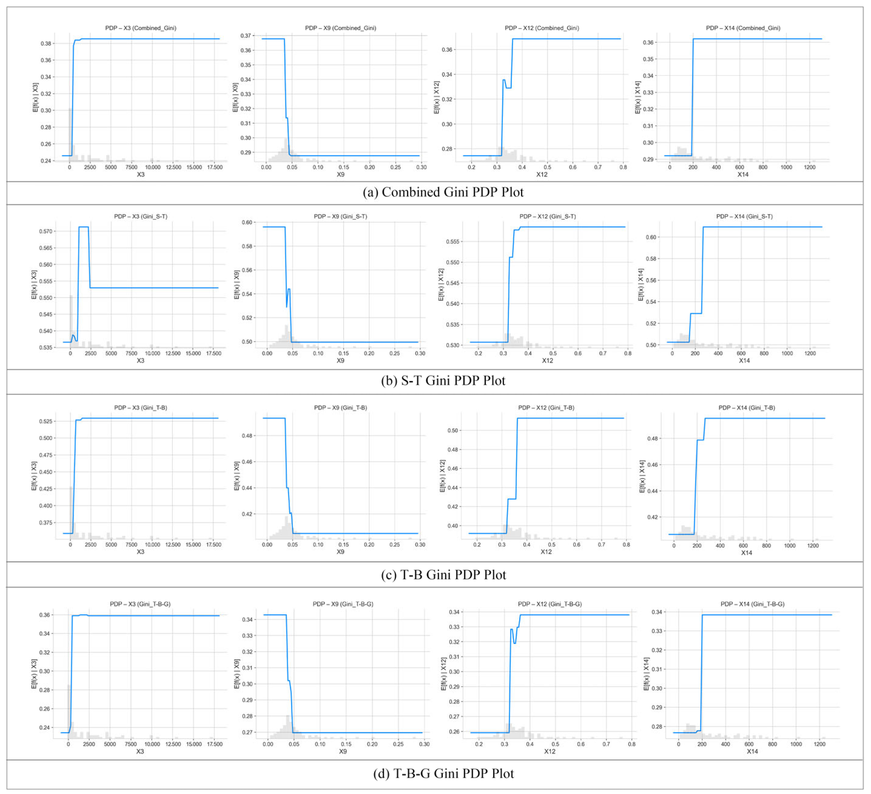 Figure 12 illustrates the partial dependence of population-weighted Gini coefficients on four explanatory variables: Asian population share (X3), commercial activity intensity (X9), transportation accessibility (X12), and crime incidents (X14), across different structural configurations including Combined, S-T, T-B, and T-B-G. The results reveal nonlinear responses of greening equity to socio-economic and environmental contexts, complementing the SHAP-based findings. In the Combined and T-B-G models, Gini values increase with higher commercial activity and transportation accessibility, suggesting that intense economic and mobility activity tends to aggravate spatial inequality. However, Gini values increase beyond moderate thresholds of crime incidents, indicating that social instability weakens greening fairness even in structurally complex systems. The S-T model maintains consistently high Gini values across all variable ranges, reflecting its limited capacity to buffer socio-economic disparities and its high sensitivity to external variation. The T-B model shows moderate equity improvement under increasing transportation and commercial activity, but this trend plateaus under high urban intensity. Overall, these patterns demonstrate that urban street-greening equity is jointly shaped by social composition, economic vitality, and safety conditions, with structural complexity enhancing stability, while socially vulnerable or high-crime areas remain prone to persistent inequality regardless of vegetation quantity.
