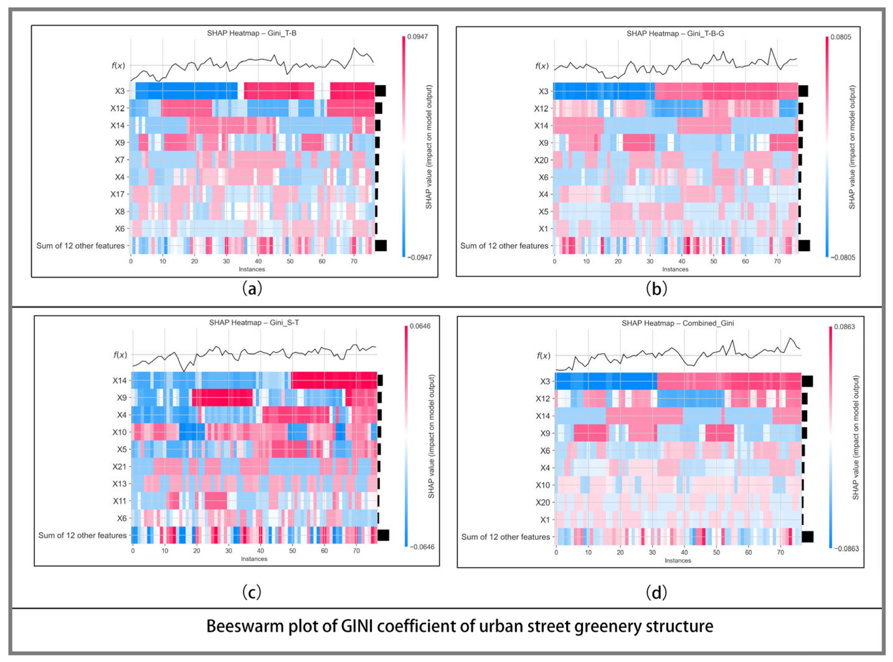 Figure 13 visualizes the interaction effects between key variables using heatmaps. Areas with higher beautiful perception and larger proportions of T-B-G vegetation correspond to lower Combined_Gini values, indicating that positive perception aligns with more balanced greening in structurally complex areas. Conversely, high Depressing perception combined with dominant S-T configurations corresponds to higher Gini values, reflecting stronger inequality in visually monotonous and structurally simple environments. These patterns suggest that perceptual and structural factors jointly shape the spatial fairness of street greening. Good visual satisfaction and social participation encourage further investment and maintenance in street greening, thereby promoting the formation and fair distribution of a good street vegetation structure. Negative views, however, hinder such efforts and perpetuate spatial differences. This results from