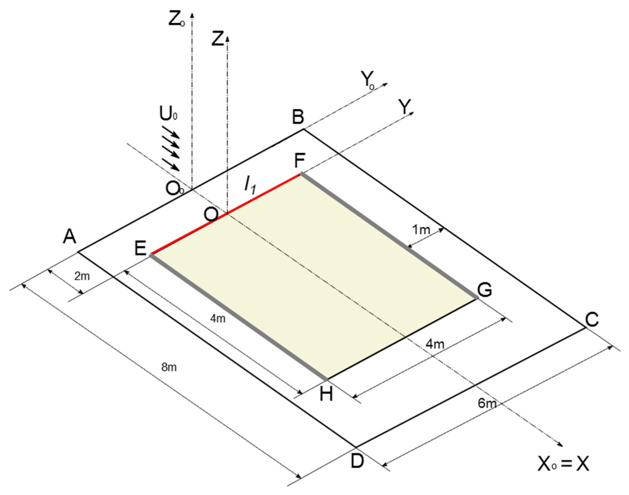 In this study, a single fire line (I1) is assumed to spread over flat terrain, both with and without fuel bed edges, under the influence of wind flow. The fire line is positioned at the beginning of the fuel bed, as schematically illustrated in Figure 1. A Cartesian coordinate system (OoXoYoZo) is adopted, with OoZo perpendicular to the ground. The study area is defined by the points ABCD, while EFGH represents the fuel bed area (with fuel bed edges). Line EF is offset by 2 m along the OoXo axis. The fuel bed is covered with a uniform layer of forest fuel to ensure consistent surface fire spread.