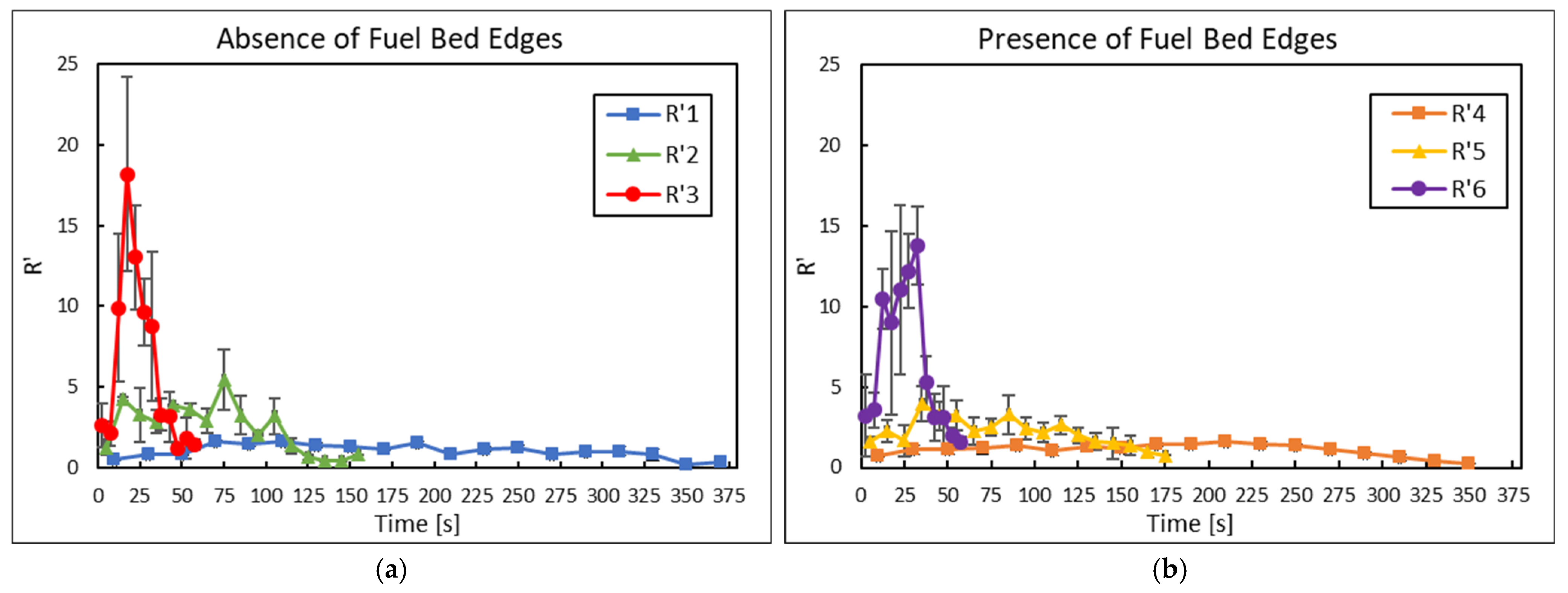 The evolution of the normalized rate of spread (R′) for different flow velocities (Figure 2) was recorded using an infrared camera, and the captured frames were subsequently analyzed to determine the R′. For this analysis, normalized rate of spread values from all experimental tests were compiled and grouped according to the corresponding flow velocities (0, 1, and 3 m/s). The series R′1, R′2, R′3, R′4, R′5, and R′6 represent the average ROS values for each respective experiment.