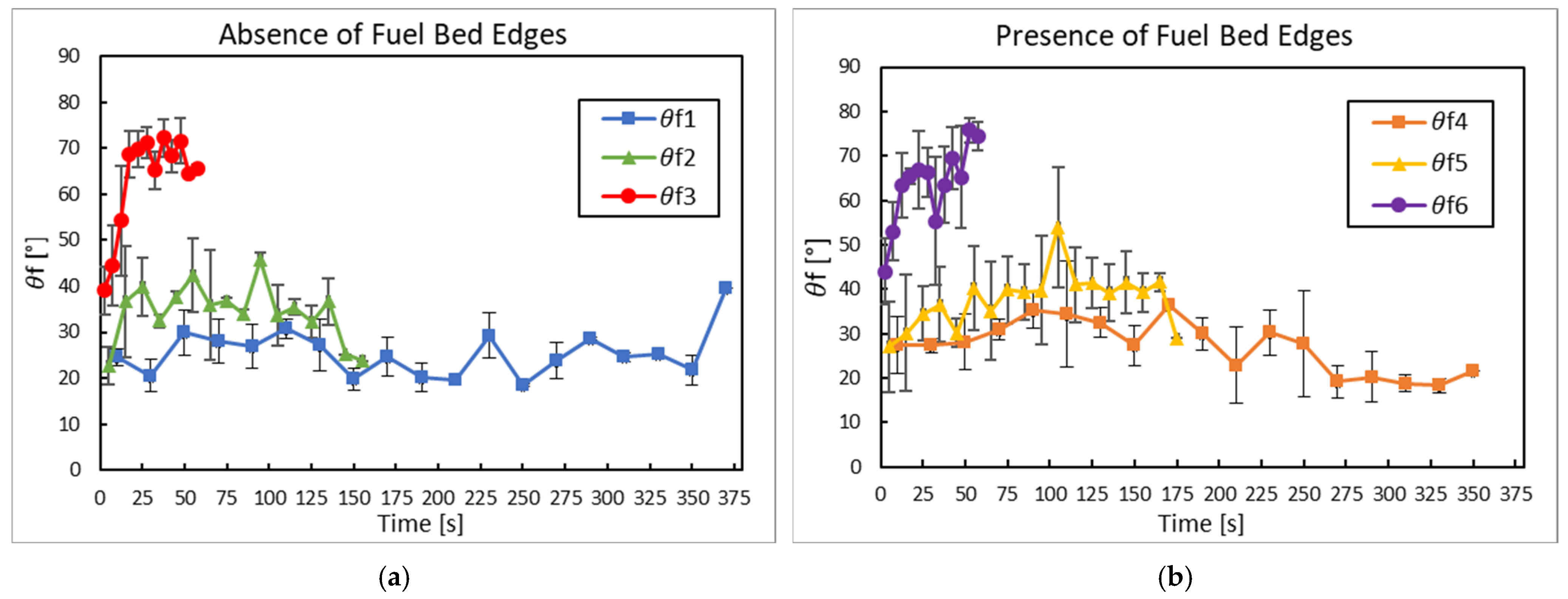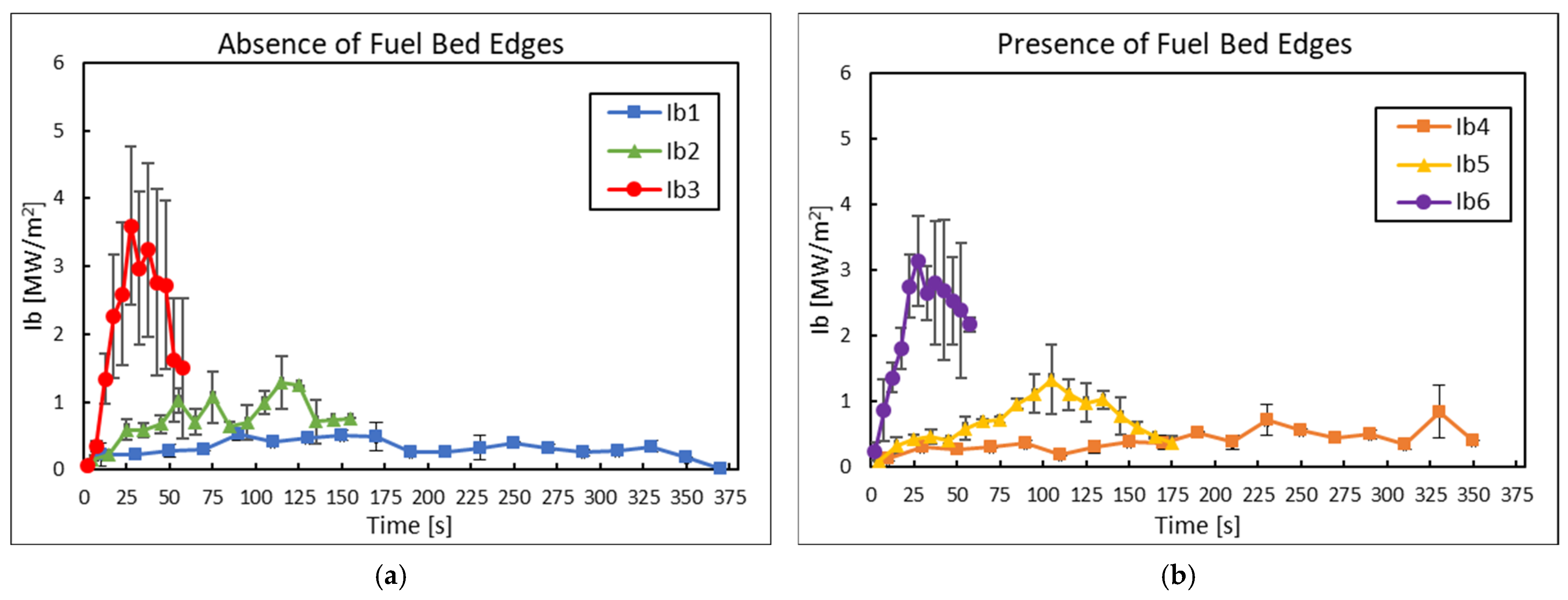 To have a better understanding of the fire behaviour when the two configurations (with and without fuel bed edges) are compared, we must resort to the fire intensity equation (Equation (6)) [39], where Lf is the flame length.