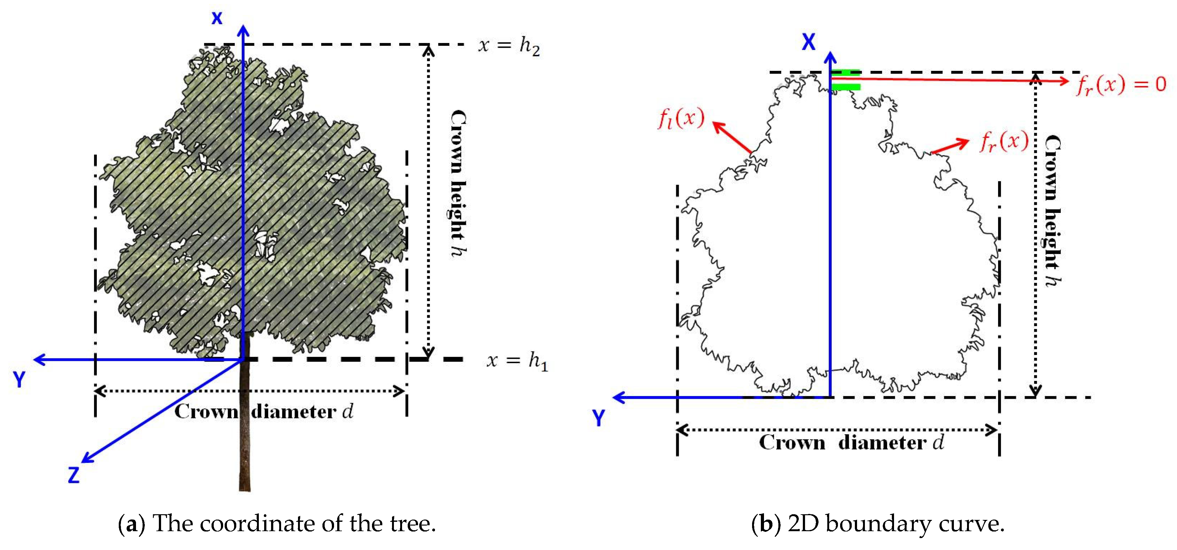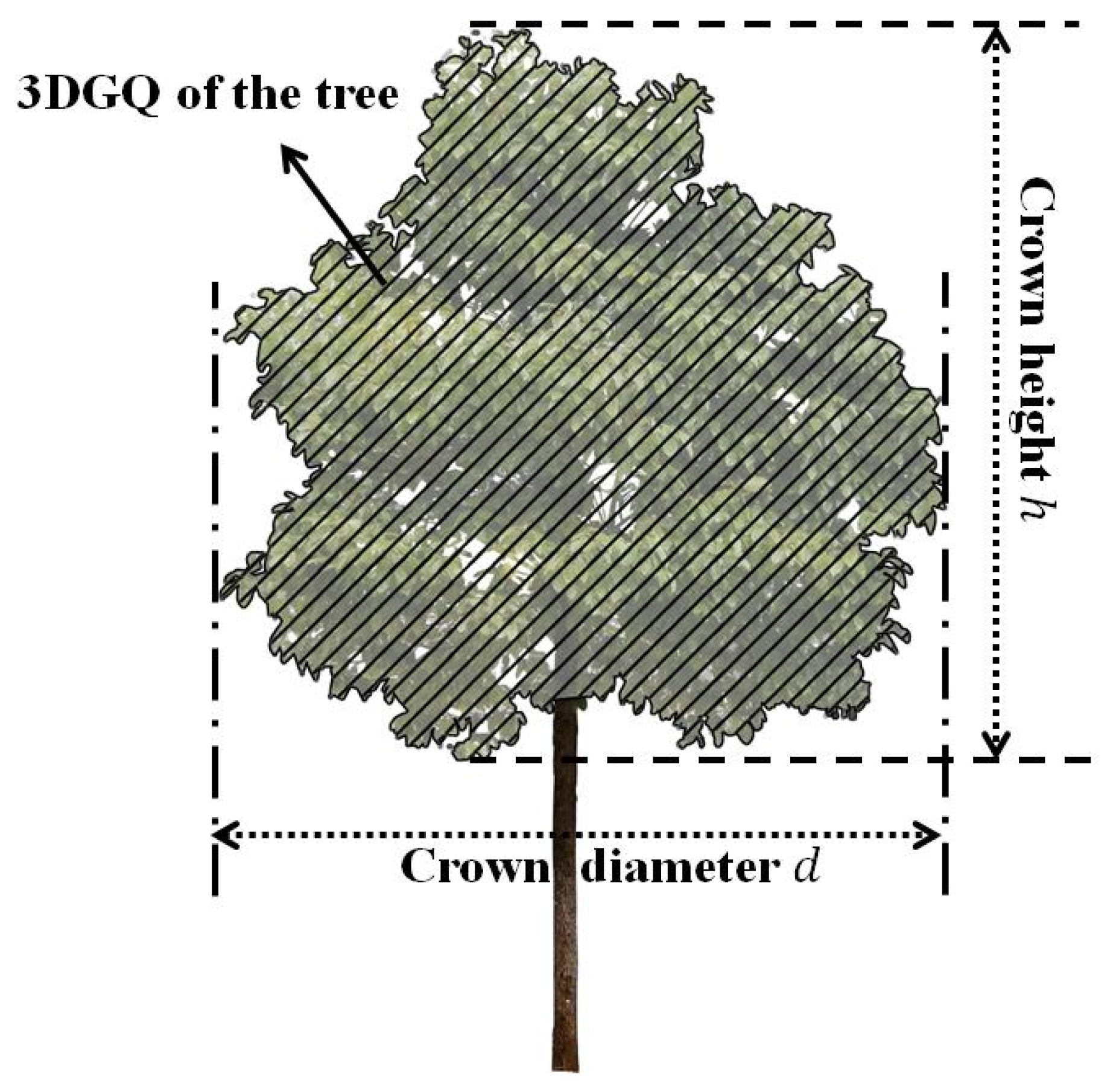 However, the shape of the canopy varies not only among different tree species, but also within the same tree species due to differences in site conditions and growth environment. Even the same tree may have different shapes due to seasonal changes, man-made pruning, etc. To reduce the error of simulating tree morphology with regular geometry, the authors proposed to segment the tree crown to obtain a number of small cones and small truncated cones. The 3DGQ can be obtained through the accumulation of truncated cones and cones [
