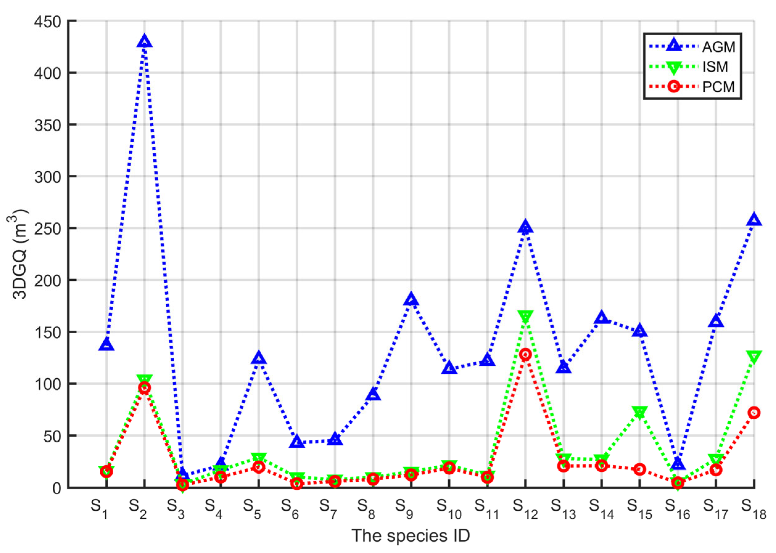 3. This huge discrepancy is because larger trees tend to have significant internal leaf gaps and complex branching, causing AGM’s single-shape approximation to over-count empty space, whereas ISM’s segmented rotational integration can partly account for those gaps. By contrast, for smaller species or those with very regular, conical crowns, AGM’s simplifications were less harmful, and all methods gave closer results.