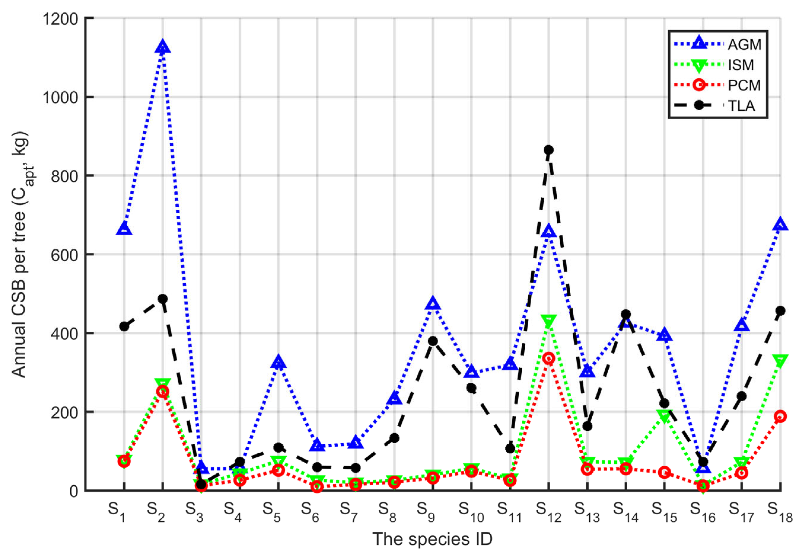3.3. Comparison of Annual CSB per Tree Estimated by AGM, ISM, LiDAR-Based PCM, and TLA