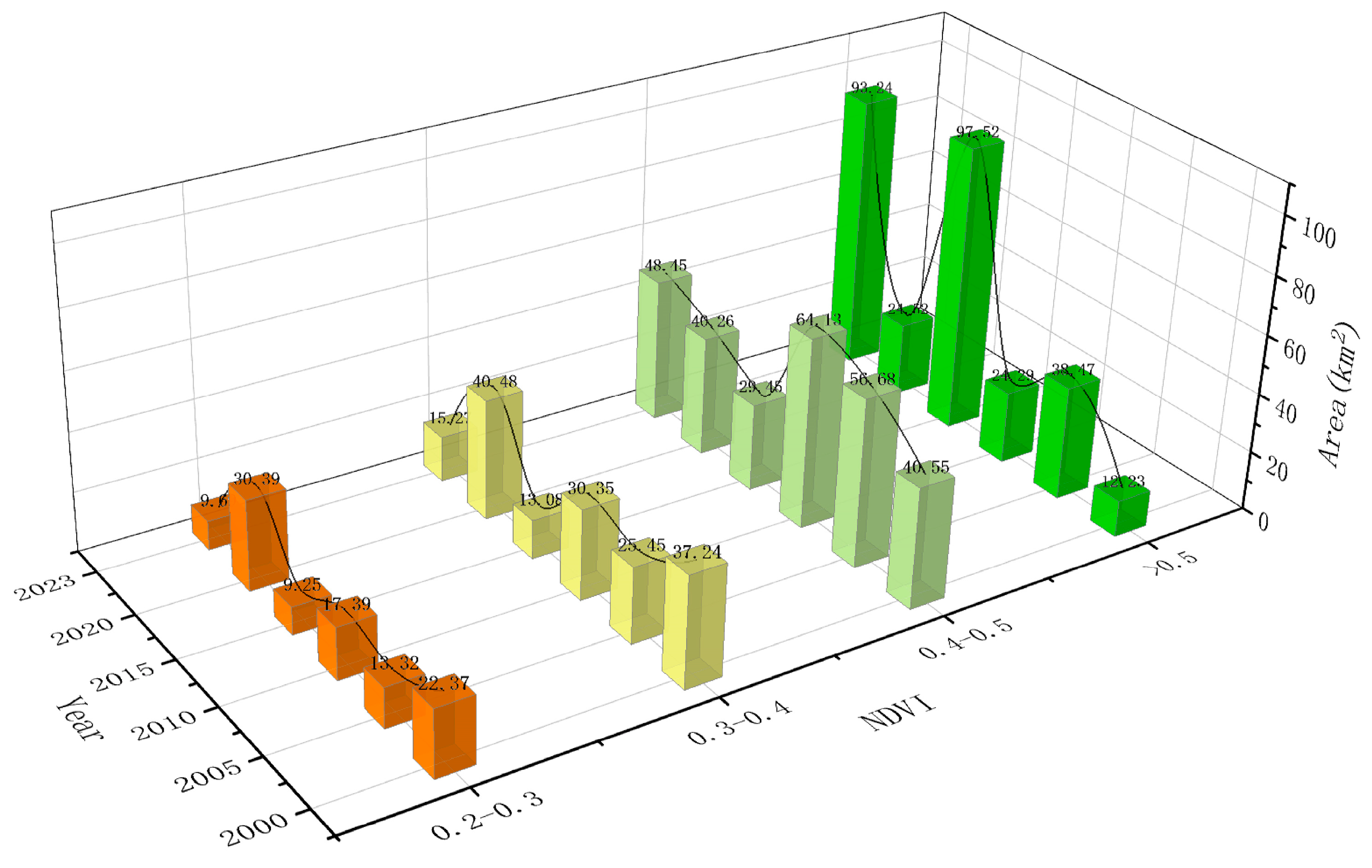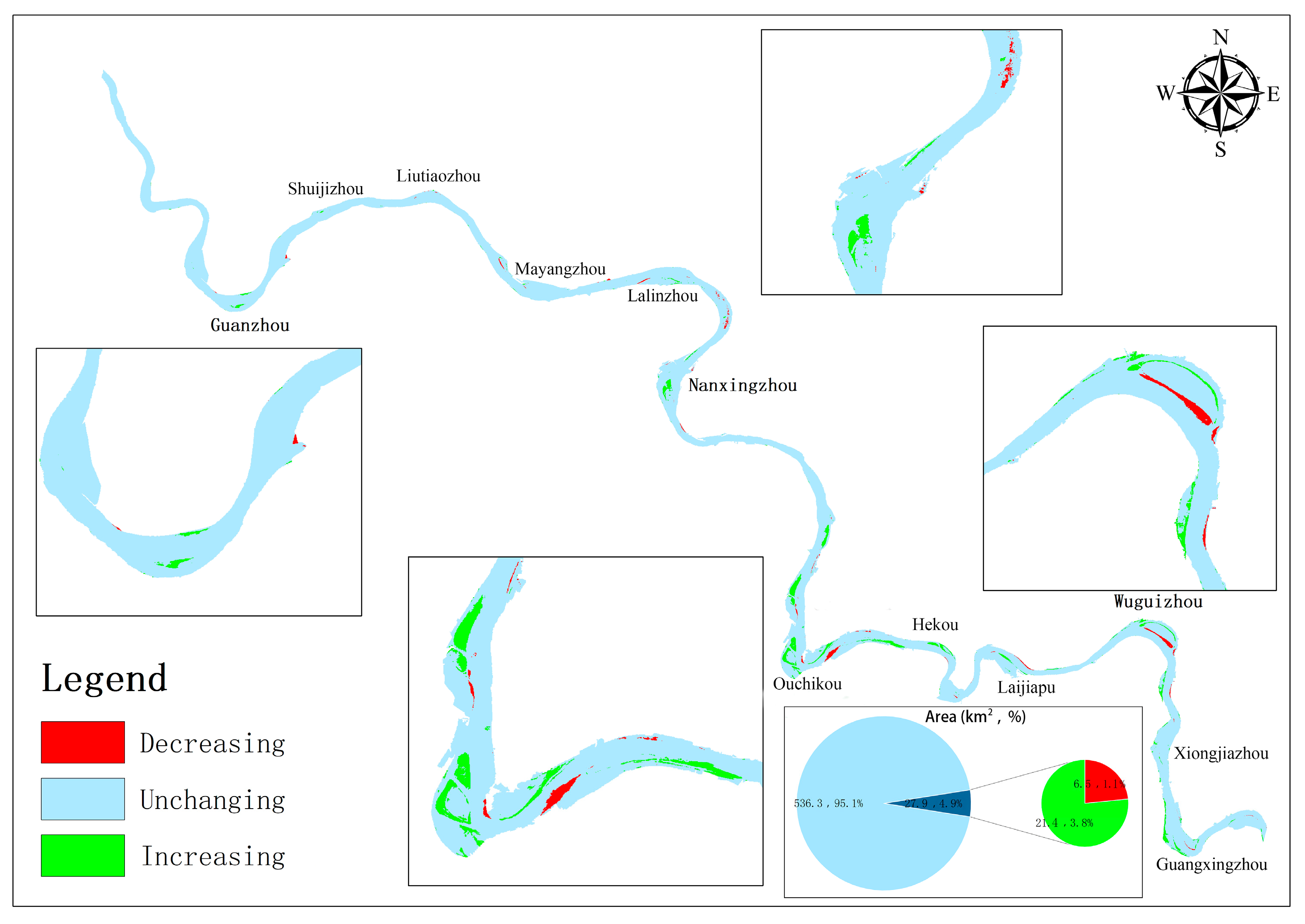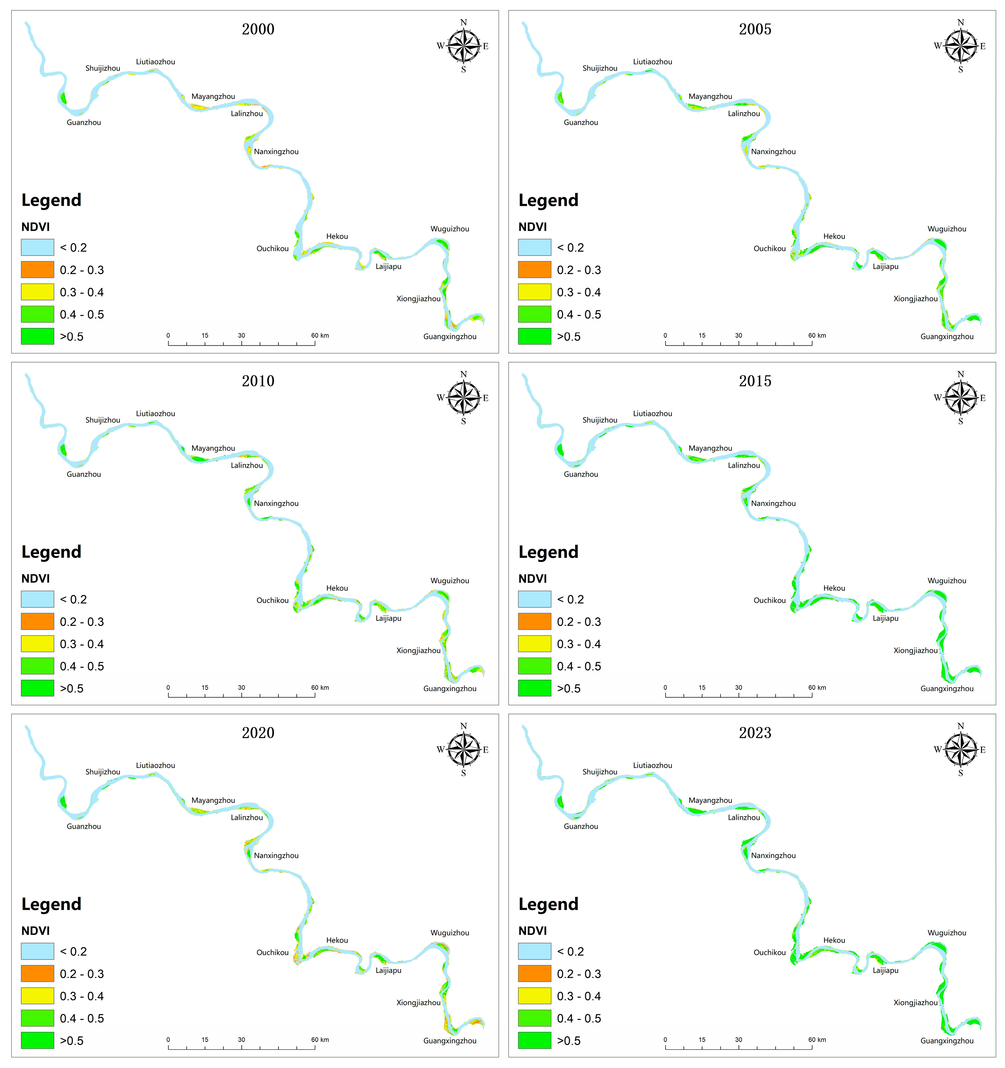 - Over six time periods from 2000 to 2023, the vegetation-covered area on floodplains in the Jingjiang section exhibited a fluctuating growth trend, with declines observed in 2010 and 2020. The total vegetation-covered area increased by 66.94 km2, with the greatest expansion occurring in high-vegetation zones (81.01 km2). Over this period, areas with unchanged NDVI values accounted for 95.1% of the Jingjiang section, primarily consisting of water bodies. Areas with increasing NDVI trends constituted 3.8%, while decreasing trends covered 1.2%. Overall, the pattern indicates fundamental stability with localized increases.