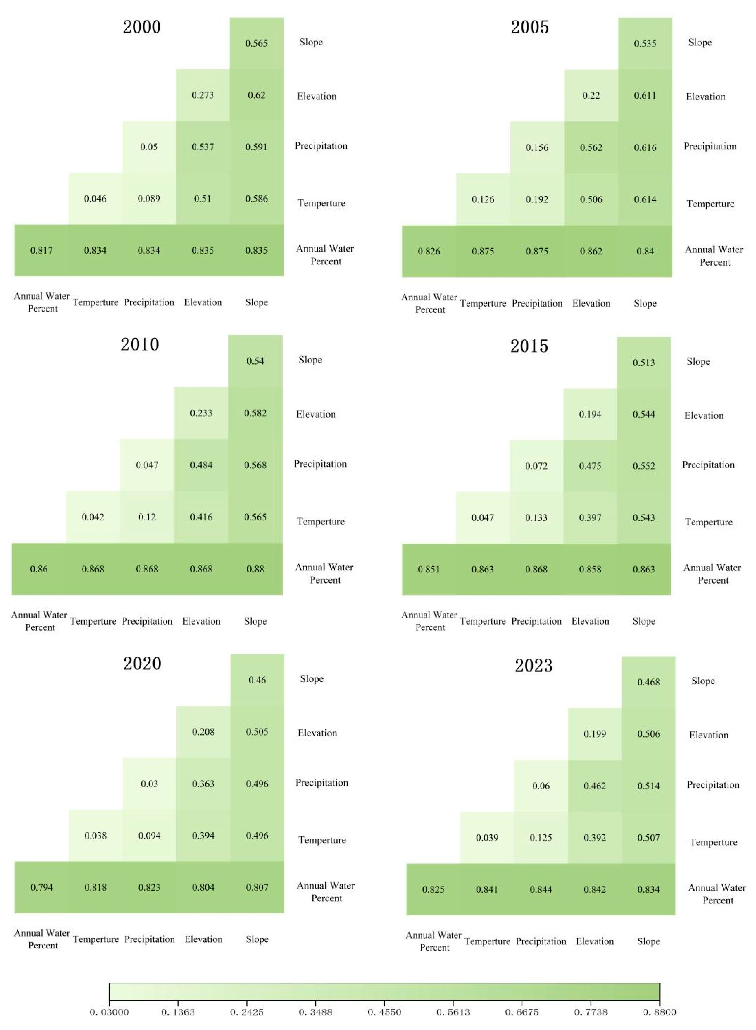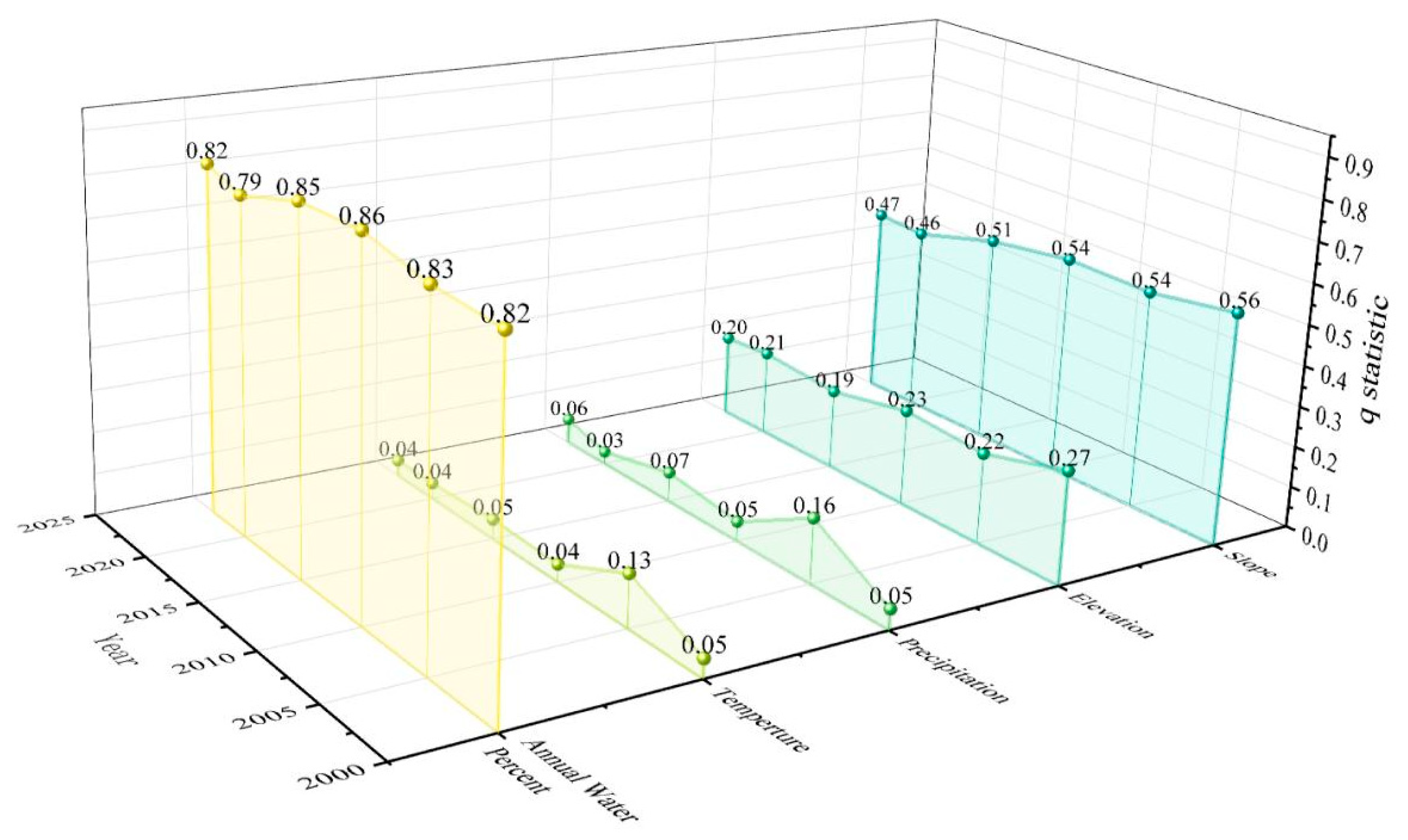 - Geodetector analysis identified inundation frequency (AWP) as the dominant factor influencing vegetation change in the Jingjiang section (q-value: 0.79–0.86), followed by slope (q-value: 0.46–0.56). Elevation had a minor influence (q-value < 0.3), while precipitation and temperature exerted negligible effects (q-value < 0.2). Pairwise combinations of these drivers produced a synergistic effect on the annual mean NDVI, indicating that NDVI distribution in the Jingjiang section is shaped not only by hydrological conditions but also by the significant combined effects of topography and climate. This suggests a synergistic mechanism operating across multiple scales.