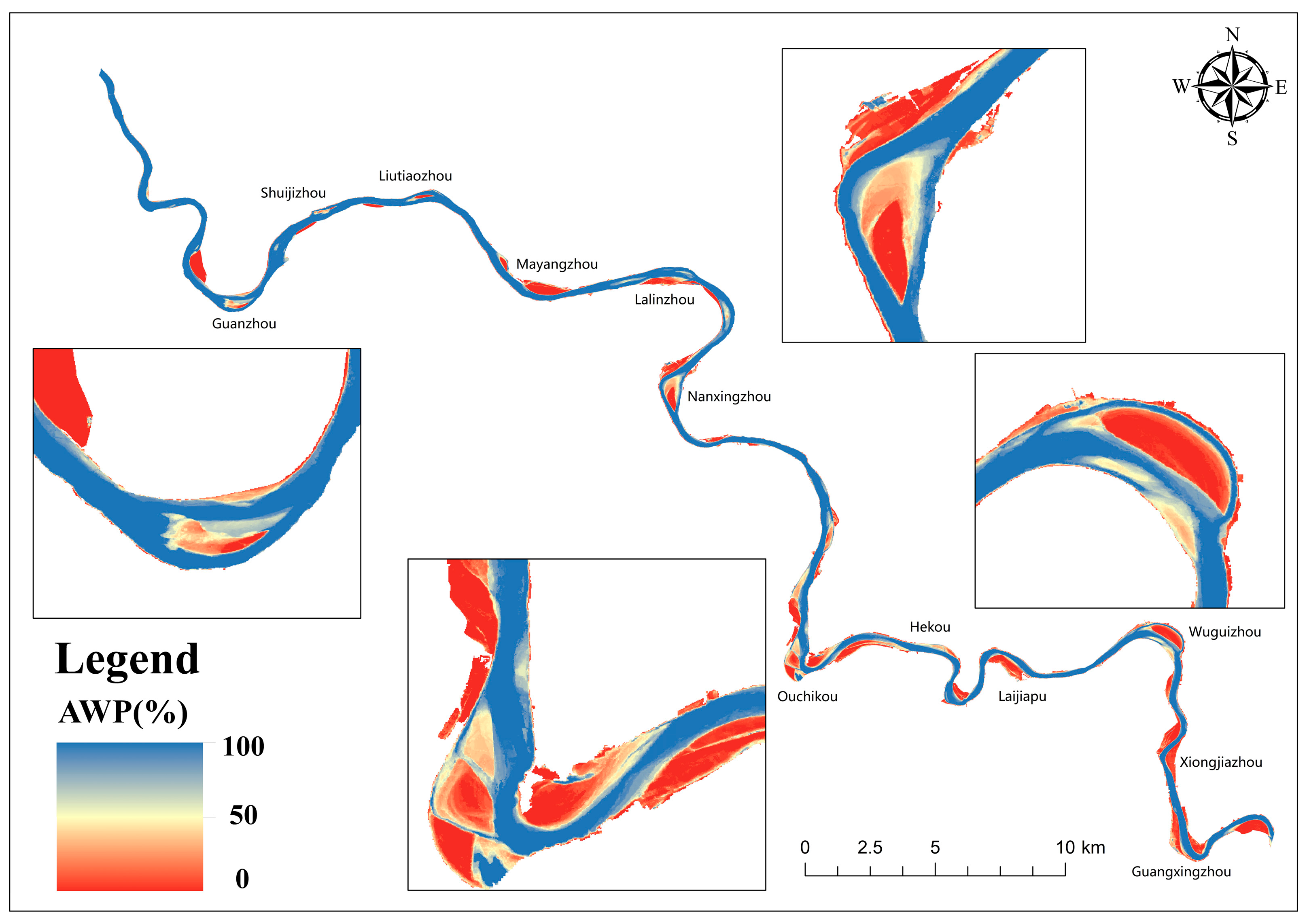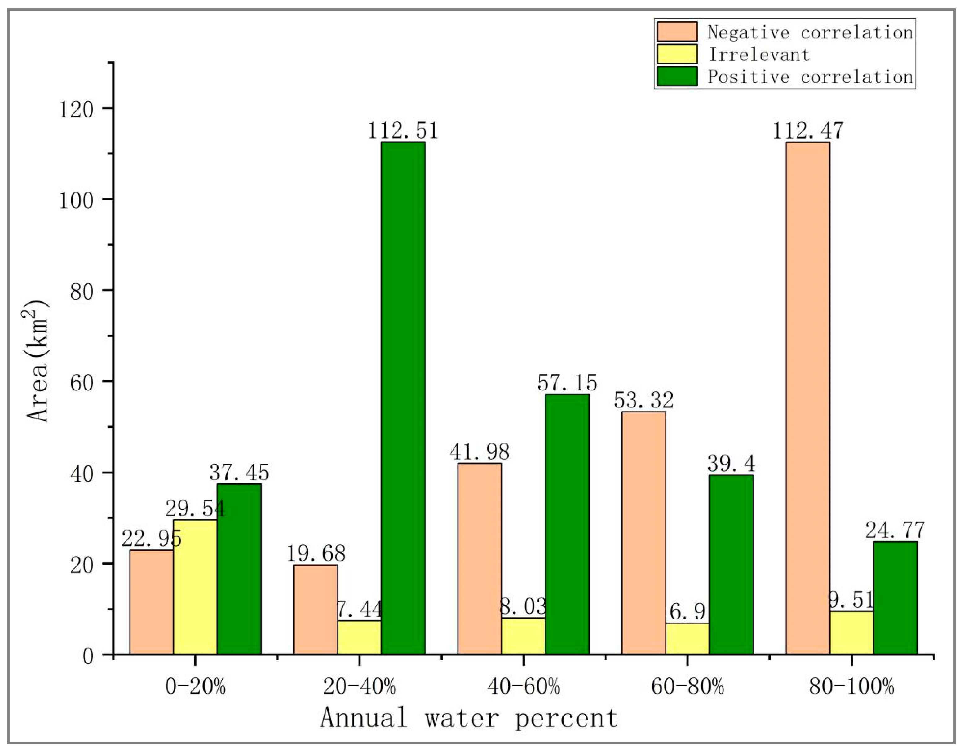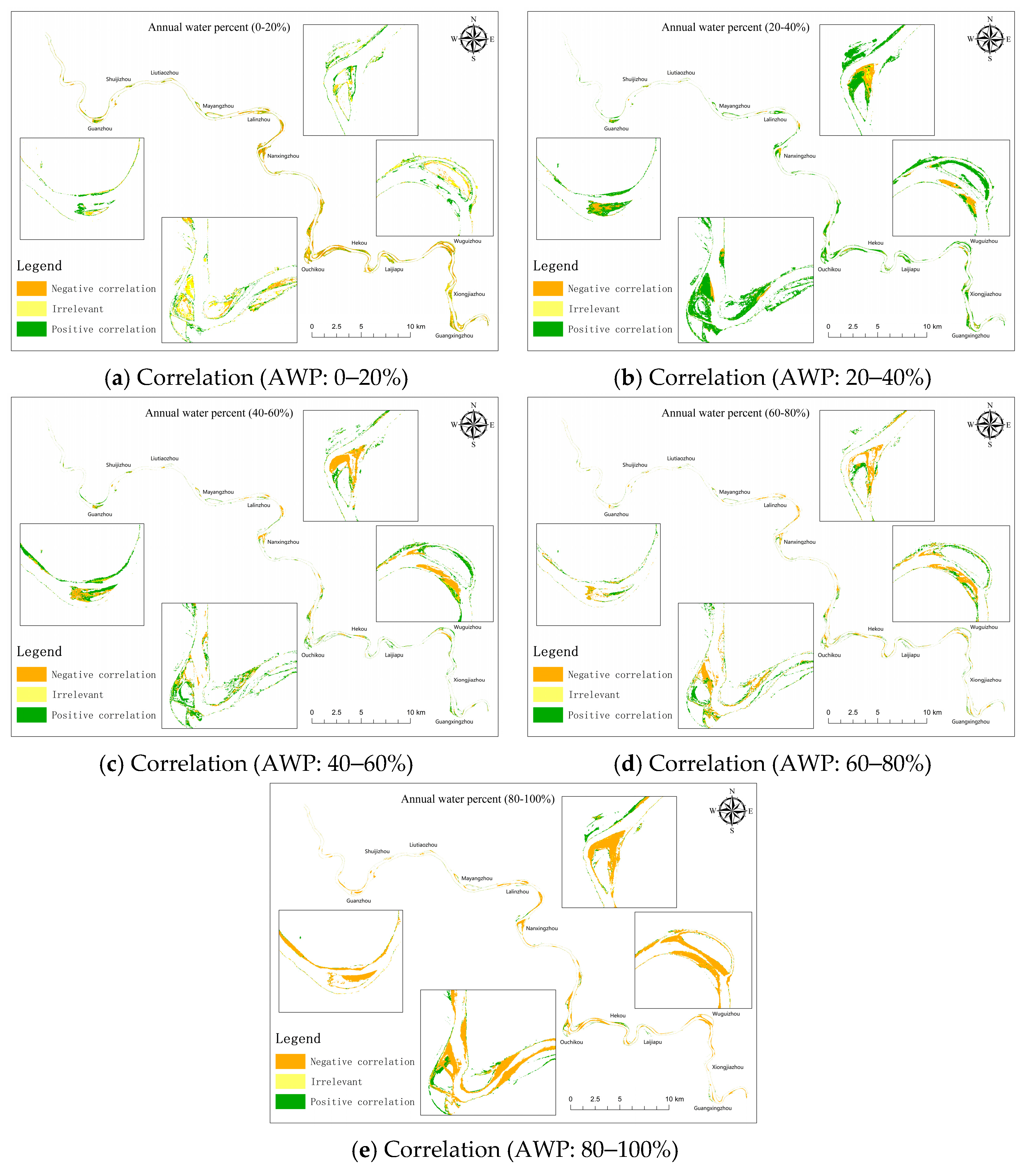 - The largest positively correlated area (112.51 km2) occurred at 20%–40% inundation frequency (AWP) and was concentrated on central and marginal bars. This inundation frequency (AWP) range conferred the strongest positive effect on vegetation growth. In contrast, the largest negatively correlated area (112.47 km2) occurred at an inundation frequency of 80%–100%, also predominantly covering central and marginal bars. This inundation frequency range imposed the strongest inhibitory effect on vegetation growth.