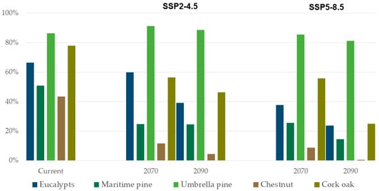 High-suitability class areas distribution (%), under current and SSP2–4.5 and SSP5–8.5 conditions, for eucalypts, maritime pine, umbrella pine, chestnut, and cork oak.