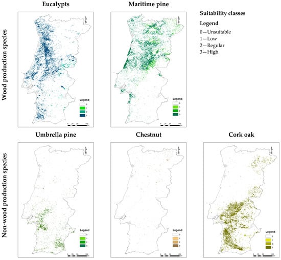 Current species forest inventory occurrences (IFN6) [18] by CEMs suitability classes for wood production species (eucalypts and maritime pine) and non-wood production species (umbrella pine, chestnut, and cork oak), in gray appears the urban areas, rivers and dams.