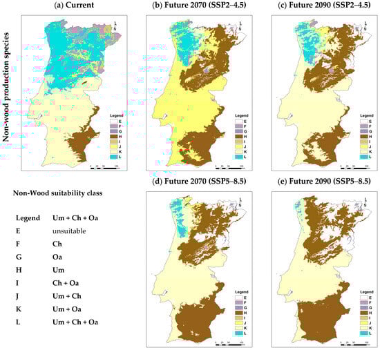 Combined CEMs of the highest suitability class (3—High) for both wood and non-wood production (Eu—eucalypts; Ma—maritime pine; Um—umbrella pine; Ch—chestnut; Oa—cork oak): (a) current; (b) future 2070 and scenario SSP2–4.5; (c) future 2090 and scenario SSP2–4.5; (d) future 2070 and scenario SSP5–8.5; and (e) future 2090 and scenario SSP5–8.5.