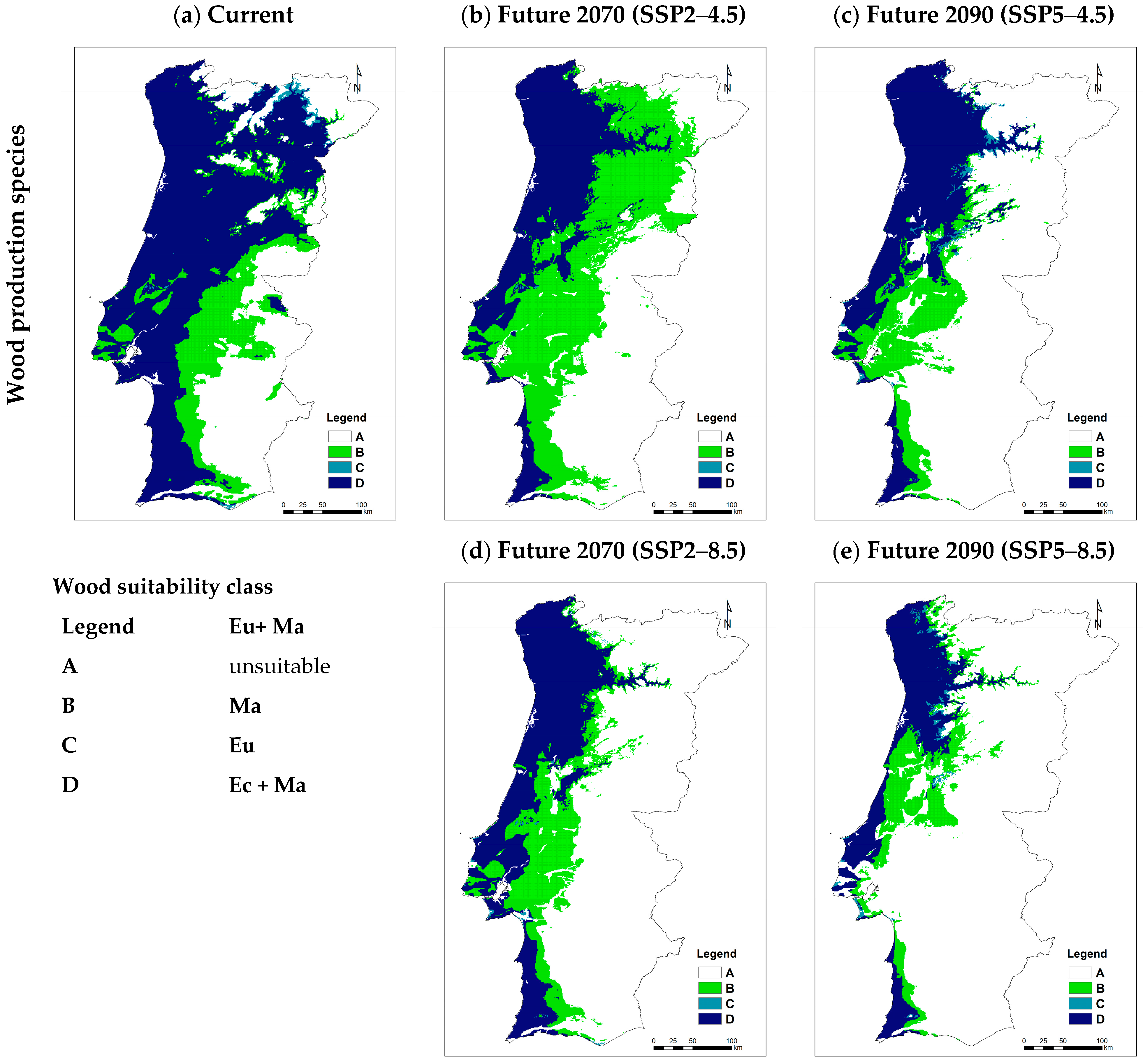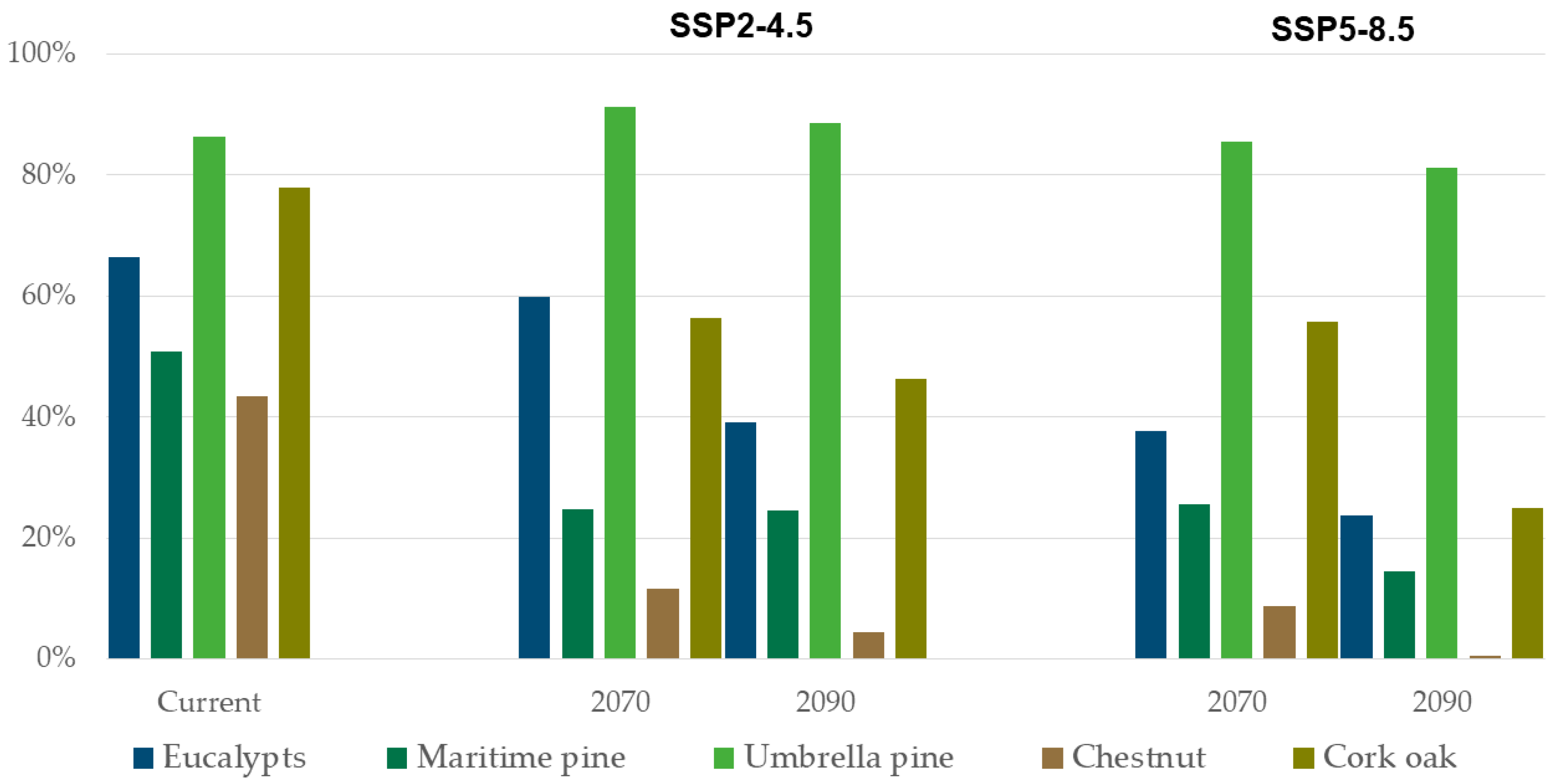 - Alegria, C.; Roque, N.; Albuquerque, T.; Gerassis, S.; Fernandez, P.; Ribeiro, M.M. Species Ecological Envelopes under Climate Change Scenarios: A Case Study for the Main Two Wood-production Forest Species in Portugal. Forests 2020, 11, 880. [Google Scholar] [CrossRef]