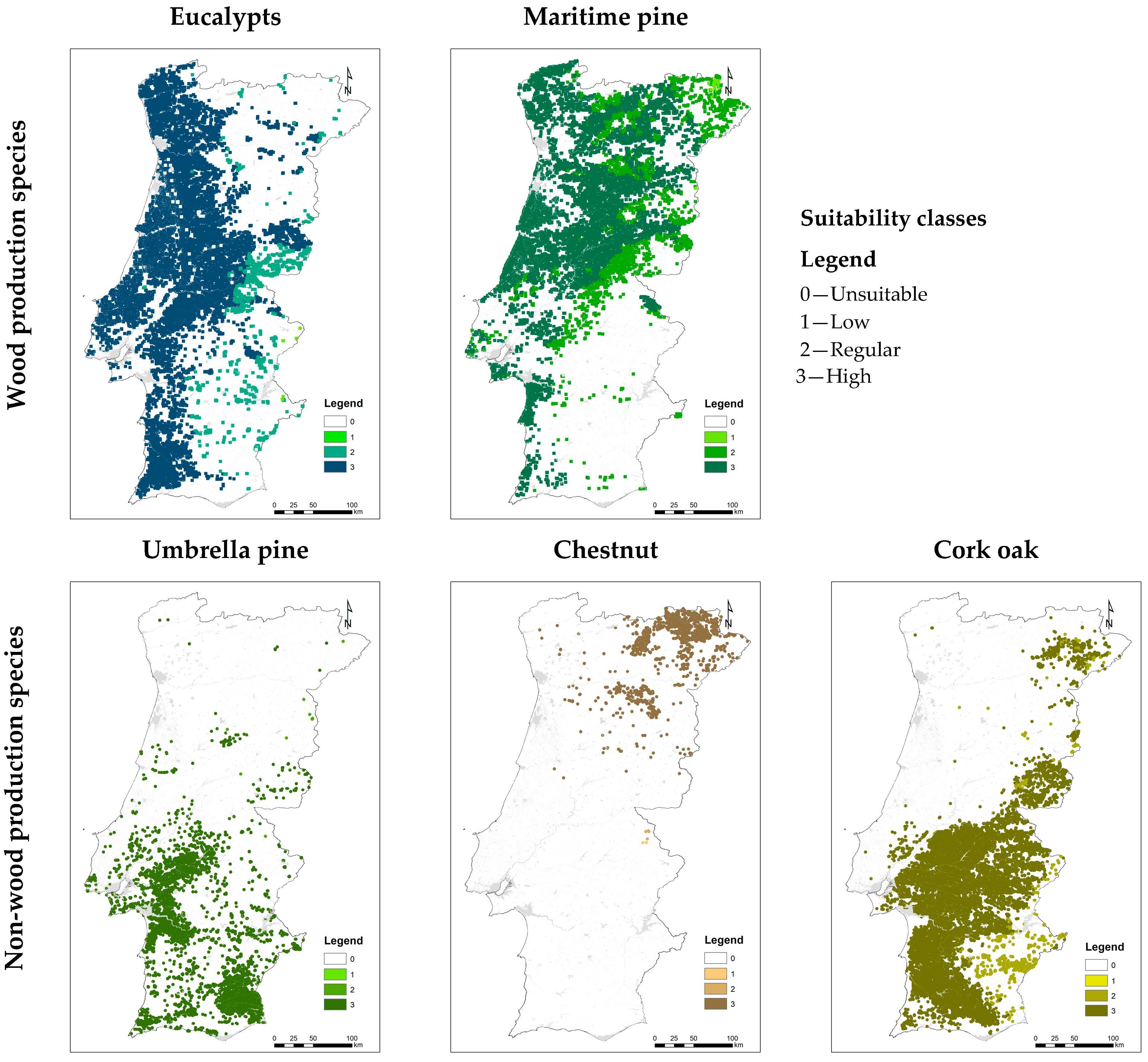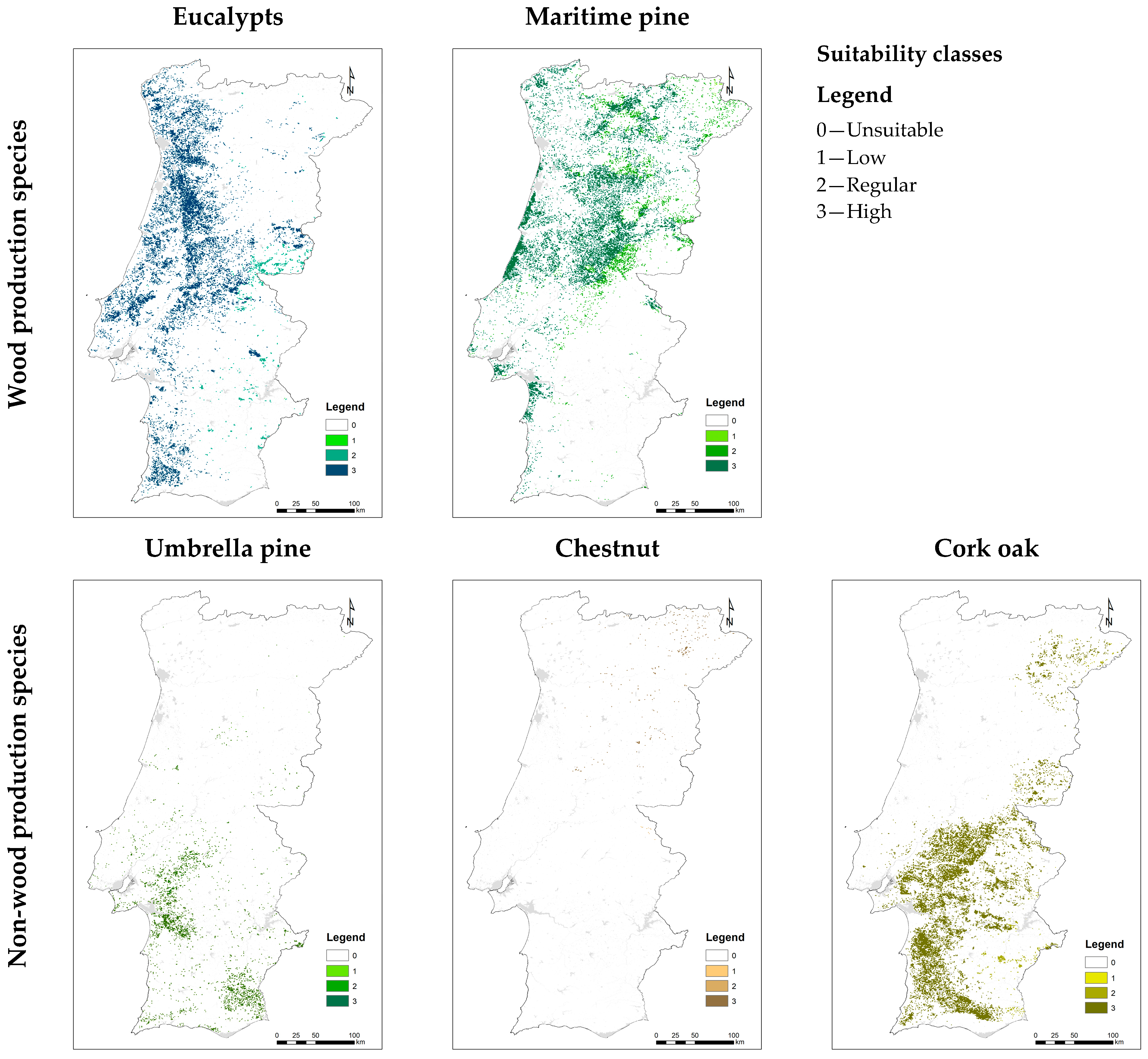 - Alegria, C.; Pedro, N.; do Carmo Horta, M.; Roque, N.; Fernandez, P. Ecological Envelope Maps and Stand Production of Eucalyptus Plantations and Naturally Regenerated Maritime Pine Stands in the Central Inland of Portugal. For. Ecol. Manag. 2019, 432, 327–344. [Google Scholar] [CrossRef]