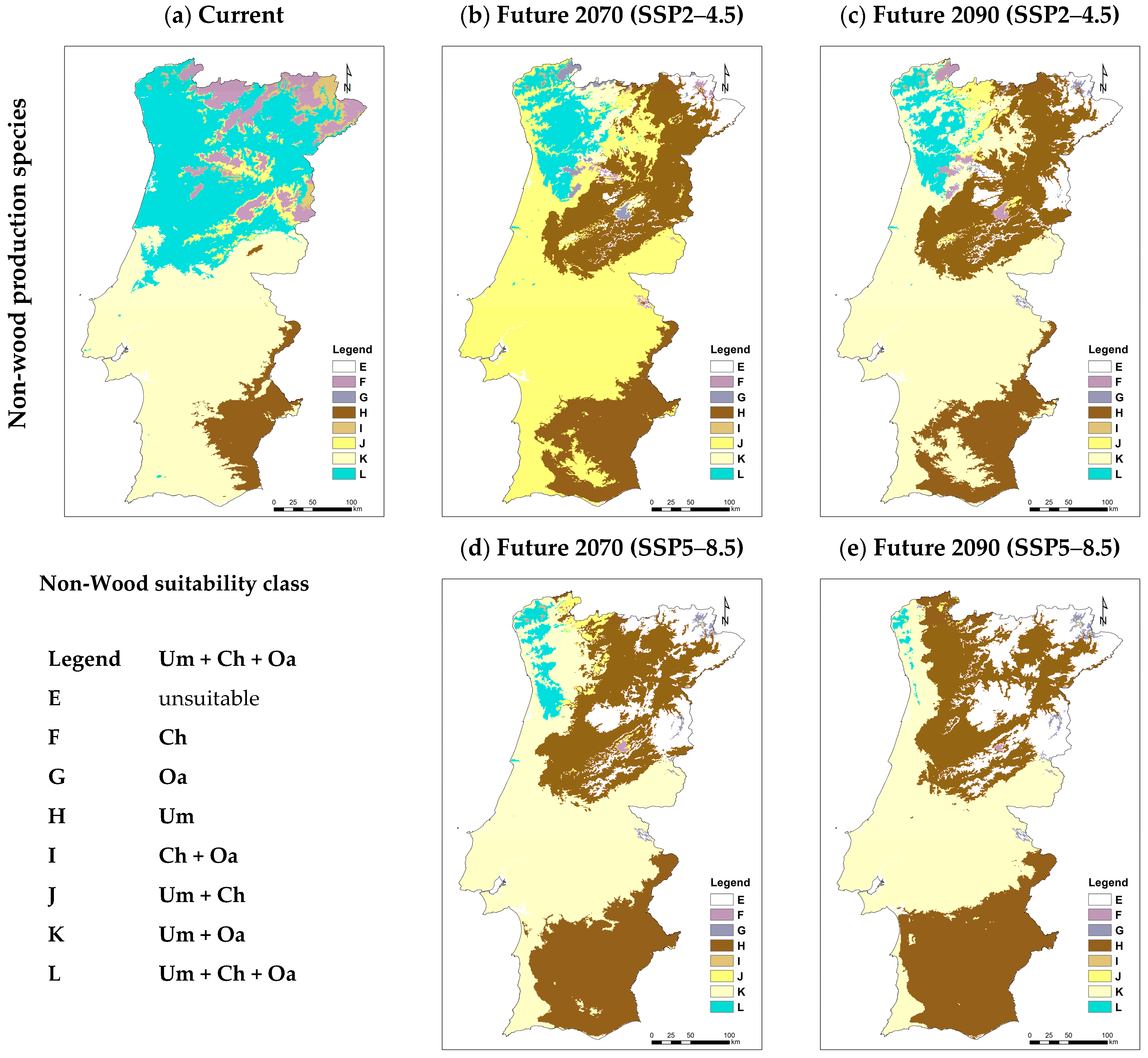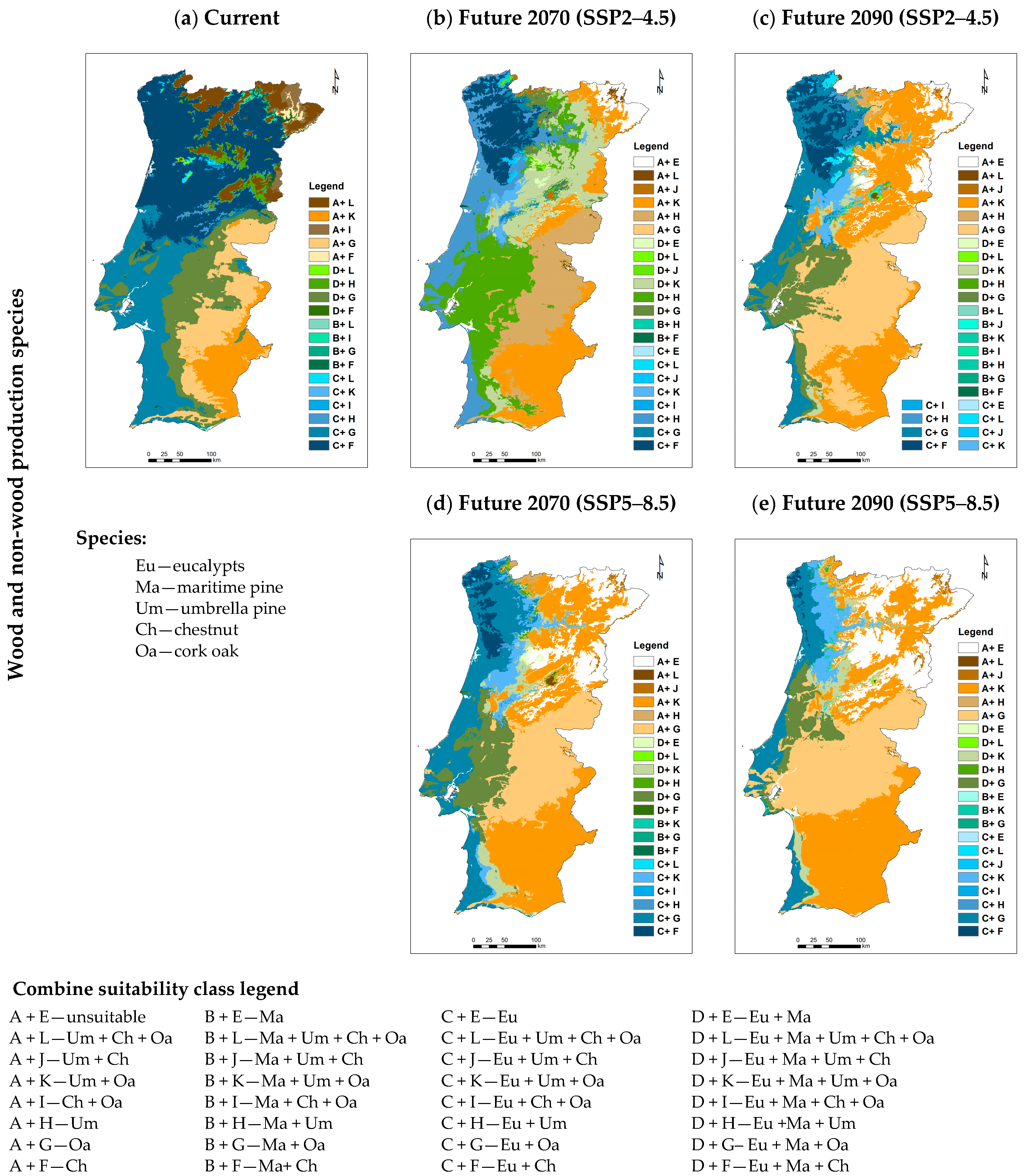 - Alegria, C.; Almeida, A.M.; Roque, N.; Fernandez, P.; Ribeiro, M.M. Species Distribution Modelling under Climate Change Scenarios for Maritime Pine (Pinus pinaster Aiton) in Portugal. Forests 2023, 14, 591. [Google Scholar] [CrossRef]