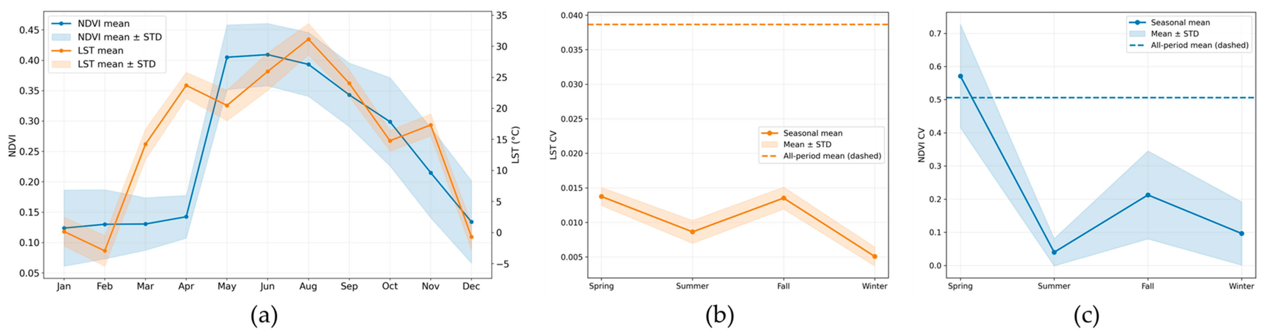 3.1. Identifying Seasonal Change in CVs of LST and NDVI