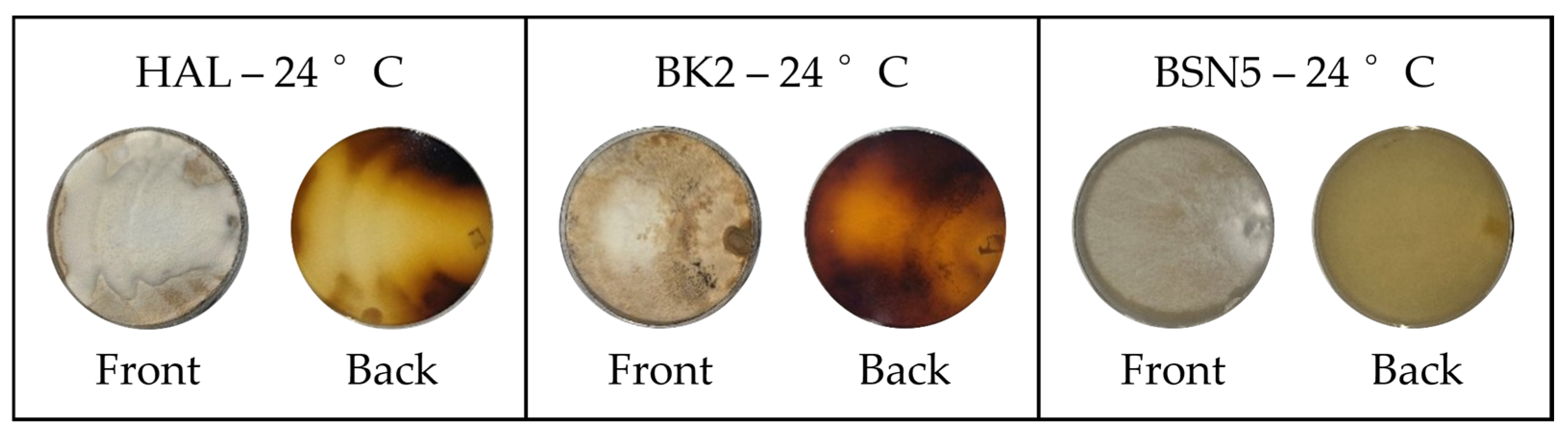 All the 90 culture plates from the above-described growth tests were examined at the end of the 4th week. Images from both the colony front (mat surface) and back side (reverse) were taken by means of a 12 Mpixel camera on an adjustable support provided with standardized light. The whole image set is reported in Supplementary Materials, whereas an example of different melanisation patterns is reported in Figure 2.