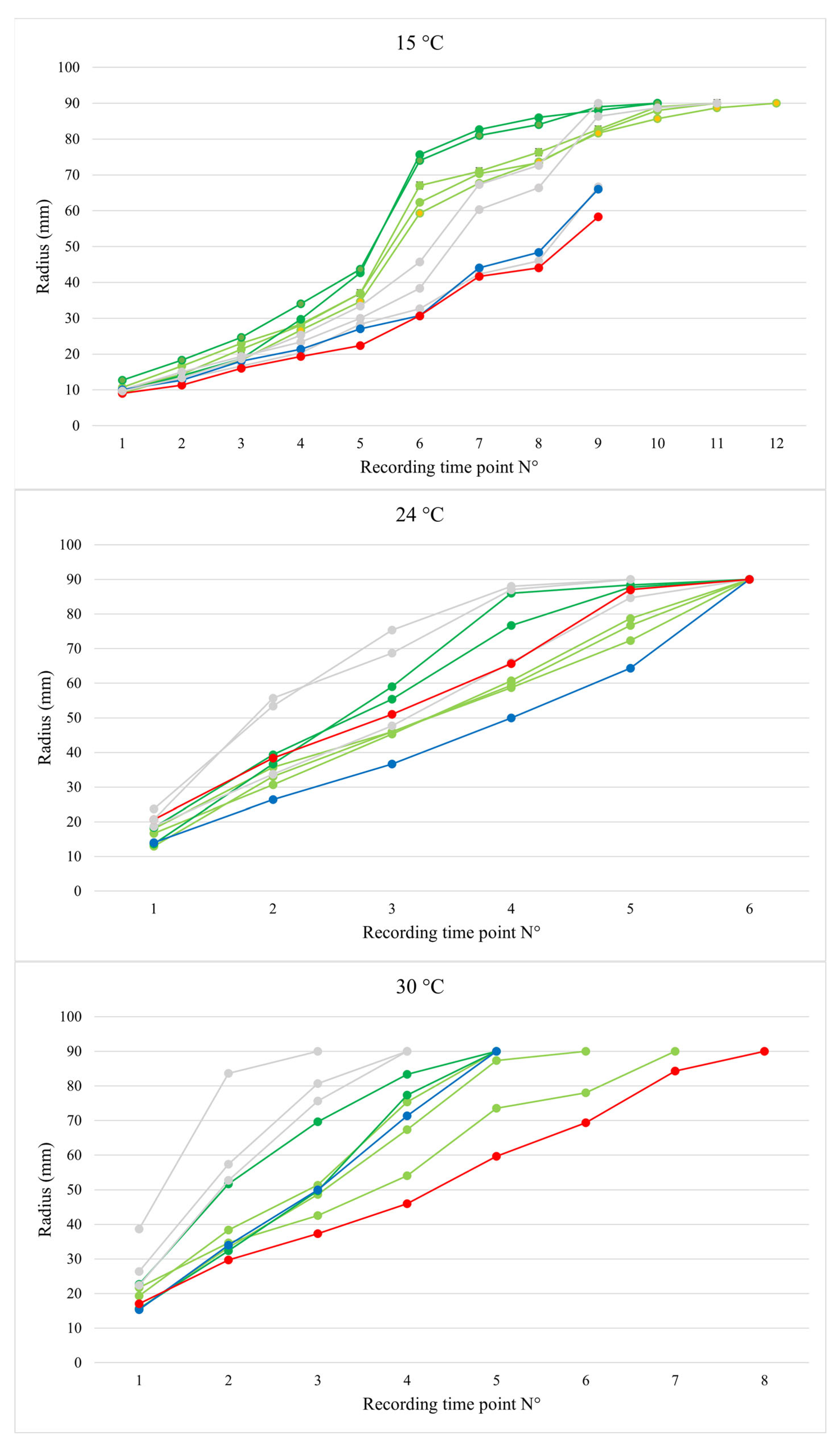 Figure 5. Raw growth profiles of the strains at different temperatures—mean of the three replicates. Records were taken every 2 days until plate coverage or4 weeks deadline. To simplify the visualization, profiles were clustered and represented as follows: dark green = Białowieża (BWZ); light green = Białystok (BK); grey = Po Plain (BSN + CSG); blue = Halden (HAL); red = Ligurian Apennines (LAM).