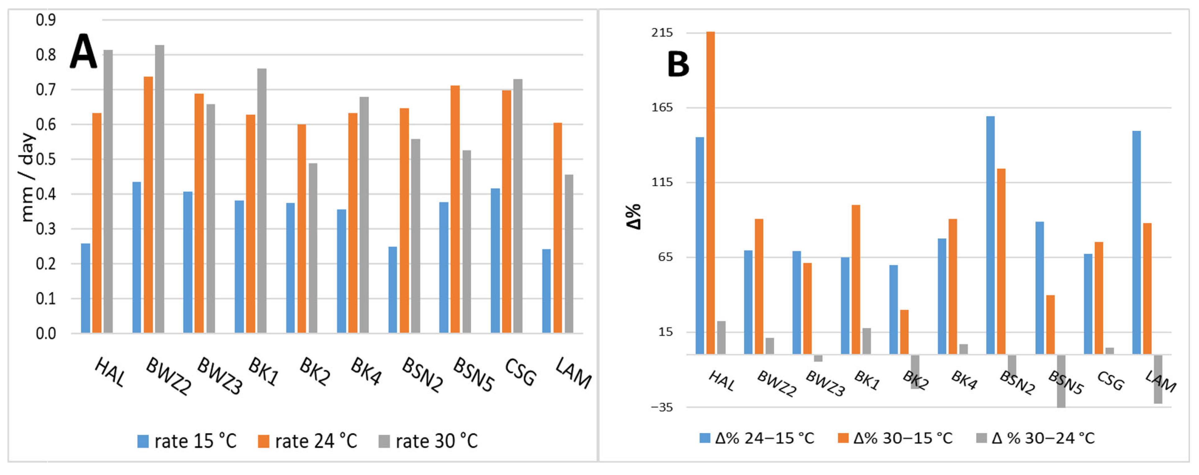 Regardless, with the geographic origin, all the strains flatten or decrease the growth rate over 24 °C, and this reveals some features poorly shown by the raw profiles. Namely, both BSN2 and BSN5 decrease their growth rate at 30 °C, whereas CSG and the Polish strains have quite inconsistent behaviour. Regarding the oceanic strains, the rates confirm the first glance from raw profiles, where HAL and LAM have opposite behaviours.
