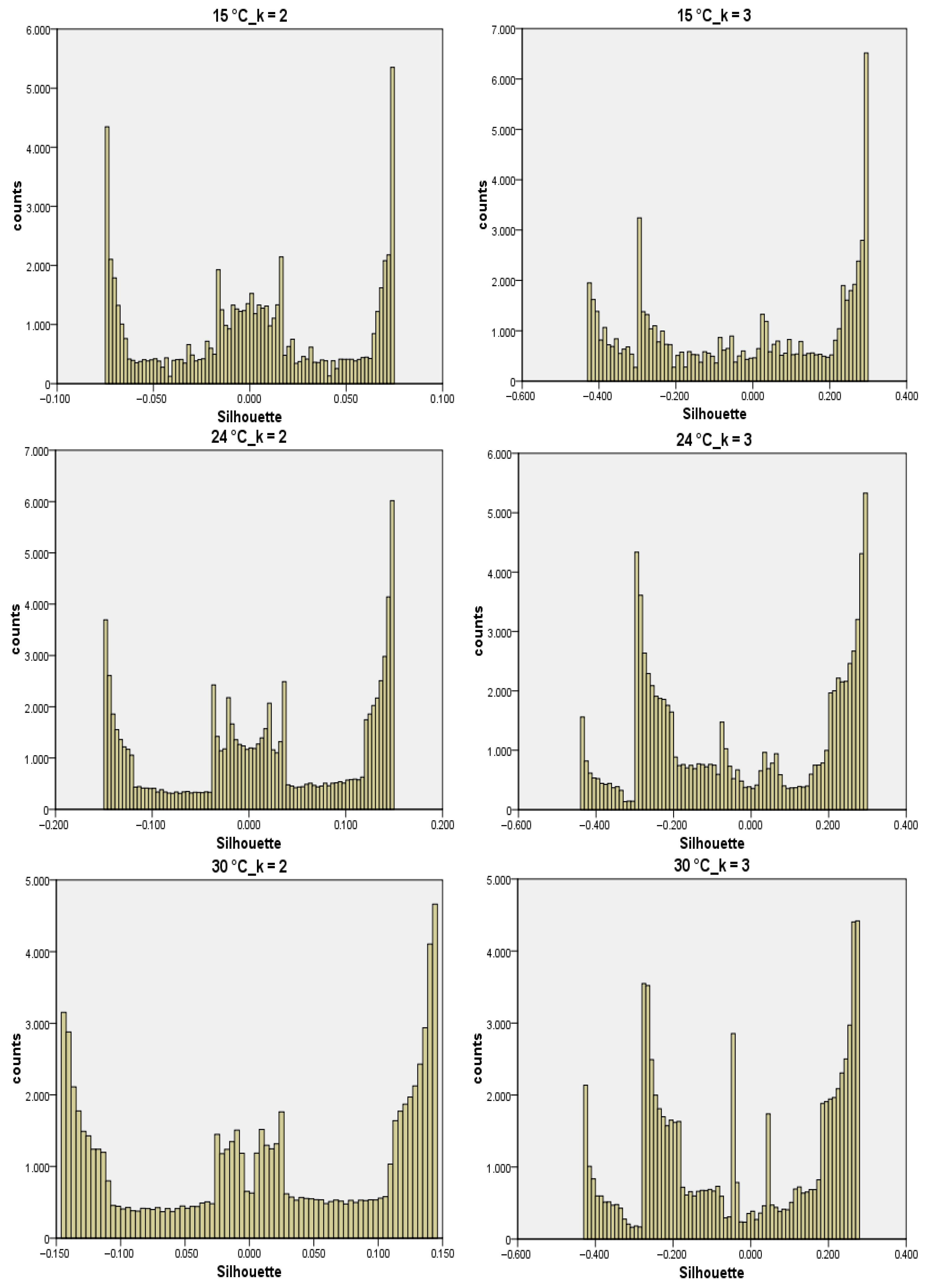 In order to verify the clustering quality, silhouette scoring [26] was run for k = 2 and k = 3 at each temperature by SPSS26. Other k values were not tested due to the extremely long data processing time consequent to the huge amount of records in each cumulative factor (68,522 at t = 15 °C; 85,814 at t = 24 °C; 79,590 at t = 30 °C). Silhouette is commonly used to explore the dissimilarity between clusters; here, the Euclidean distance was applied along with Minkowski’s power = 2.