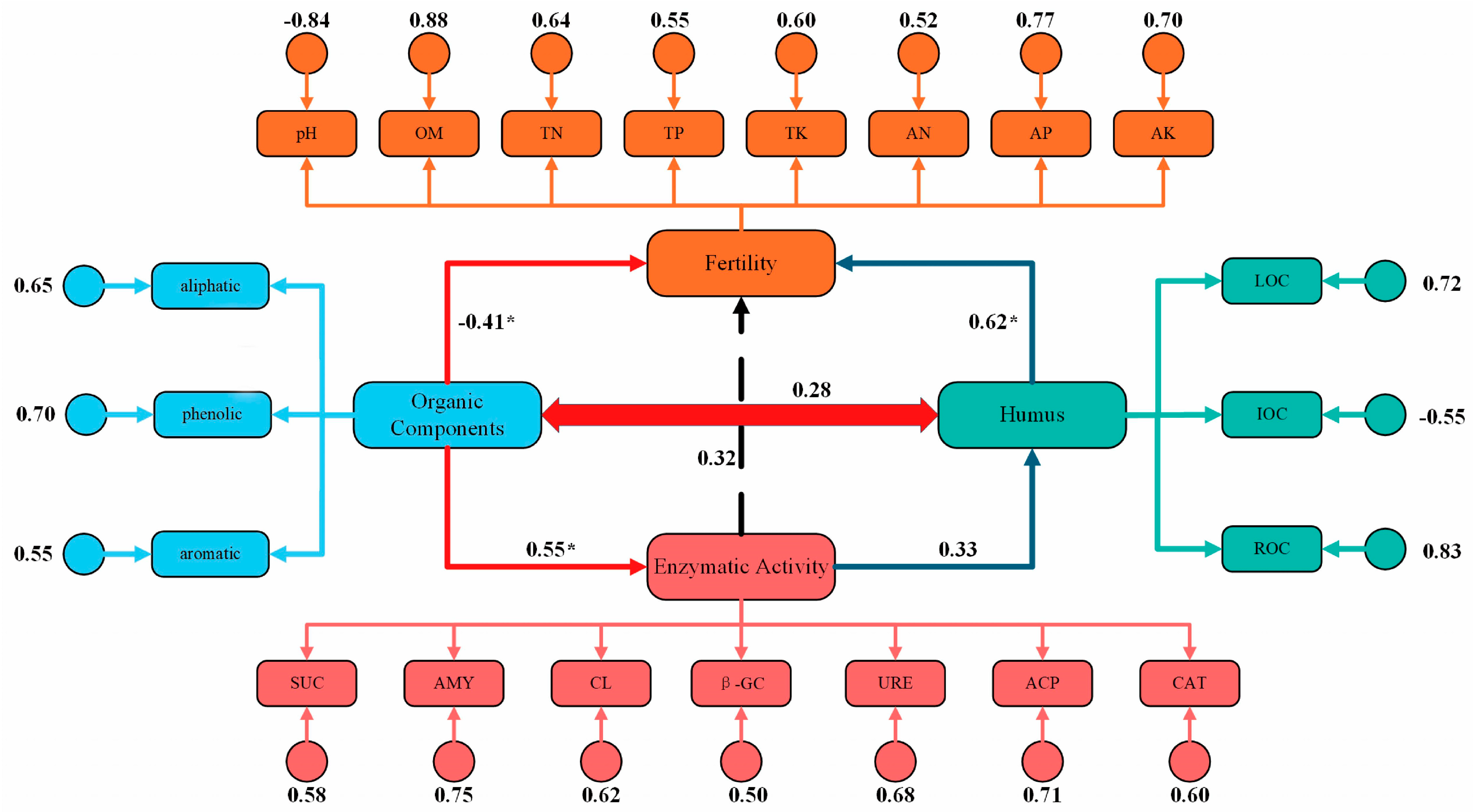 - To explore the causal relationships between organic functional groups (based on FTIR), enzyme activities, humus components, and soil fertility by constructing and evaluating a Structural Equation Model (SEM), thereby identifying the key pathways through which companion tree species influence soil functionality.